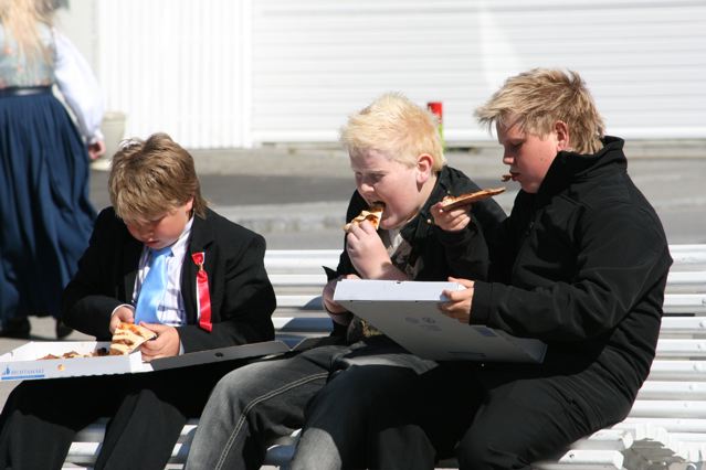 17 mei was de nationale feestdag van de Noren. Een groot deel van de mannen, vrouwen en kinderen lopen in de klederdracht van de streek. Het is met name een kinderdag. Met twee keer een optocht, veel vlaggetjes, de plaatselijke brandweer( die heb je wel nodig met al die houten huizen), het rode kruis en een in vol ornaat gestoken dominee, die bijna een uur zijn zegeningen over de goegemeente heeft uitgestort.