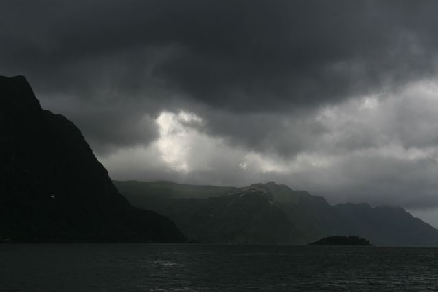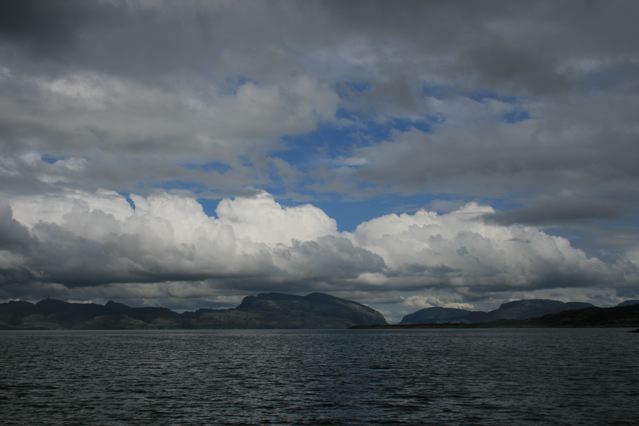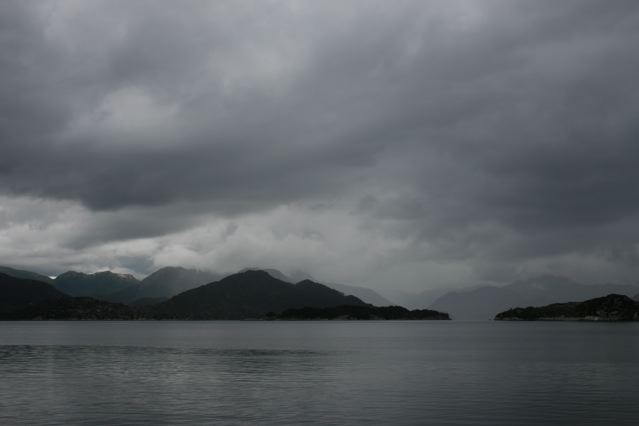 Dan, eigenlijk vrij plotseling, zien we donkere bergen, in zwart-donkerblauw-paarse kleuren van het Sognefjord opdoemen( het langste fjord ter wereld) . Donkere onweerswolken erboven, gaven het geheel nog een extra dreigende aanblik. Het deed denken aan die tweede nacht op onze tocht van Harlingen naar Mandal, toen we tussen geheimzinnige, op bergen gelijkende, mistflarden voeren.