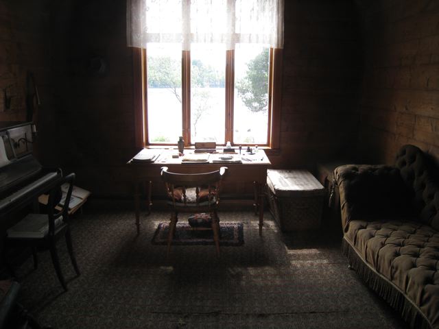Grieg had er ook zijn werkplek, een huisje onder de concertzaal, waar zijn werktafel, een sofa en zijn piano staan. Op de zitting van de stoel achter de piano ligt een dik boek met de Sonates van Beethoven . Dat boek ging mee, als hij een concert moest geven. Grieg was niet groot van postuur, hij was 1.52 meter lang en had zo van de werken van Beethoven dubbel plezier: inspiratie en een prettige speelhoogte.
