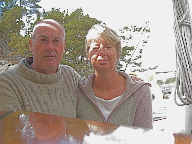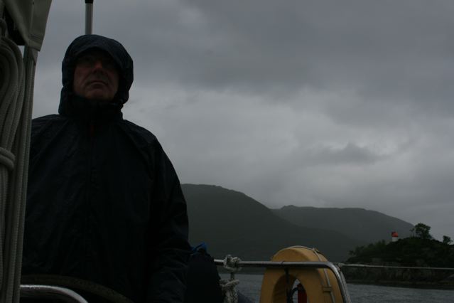 Een Noor presteerde het om in de vroege ochtend langszij te willen komen, toen we ons net nog eens lekker in bed omgedraaid hadden, gesterkt om te blijven liggen door het geluid van de aanhoudende regen en de wind. Hij was alleen en klopte met de pikhaak op ons dek.