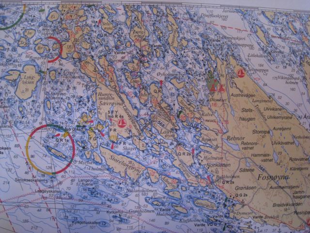Op de laatste foto zie je een overzicht van een Noorse zeekaart, een gebied waar we door varen. Op het eerste gezicht een wirwar van eilandjes, rotsen en smalle doorvaarten. In de praktijk valt dat steeds weer mee, omdat de hoofdroutes goed gemarkeerd zijn. We bestuderen de kaart uitvoerig of de bruggen en de elektriciteit-draden voldoende hoog zijn. Soms zijn ze net te laag en moet je een andere route kiezen. De diepte moeten we ook constant op de meter in de gaten houden, naast dat, wat we op de kaart en de plotter zien.