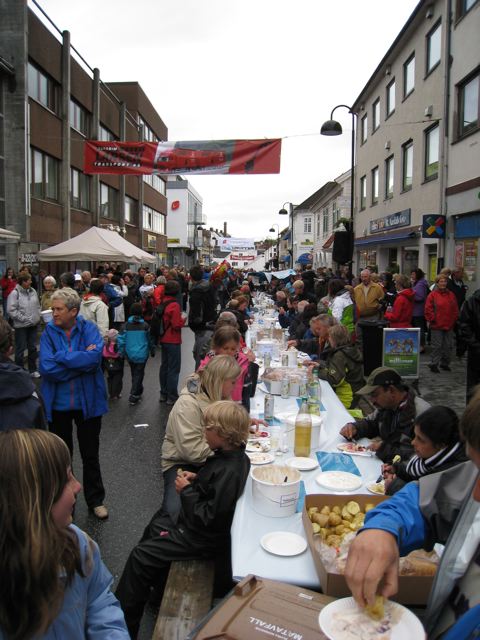 Een bandje speelde Noorse populaire deuntjes die de mensen meezongen. “What shall we do with the drunken sailor”was het enige liedje dat we konden mee-brullen, al was er in het hele dorp, dat toch krioelde van de mensen, geen enkele dronkelap te zien, maar misschien was die nog niet op de been.