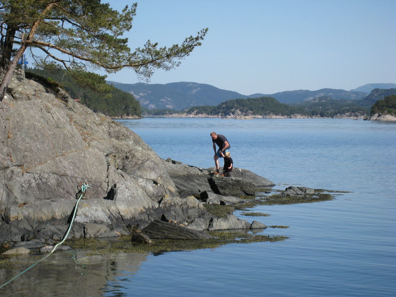 Ik heb in een poging tot vissen de lijn met haken en pluimpjes die ik in Kristiansand bij een hengelwinkel had gekocht, ook een keer in het water laten zakken toen we in Sundal aan de steiger lagen, maar schrok terug van het idee dat er wel eens een vis aan kon vastbijten.