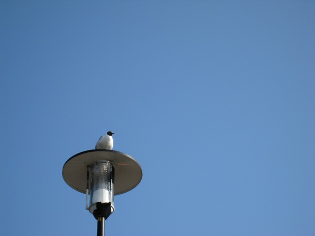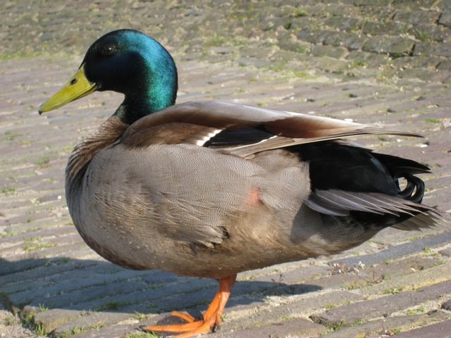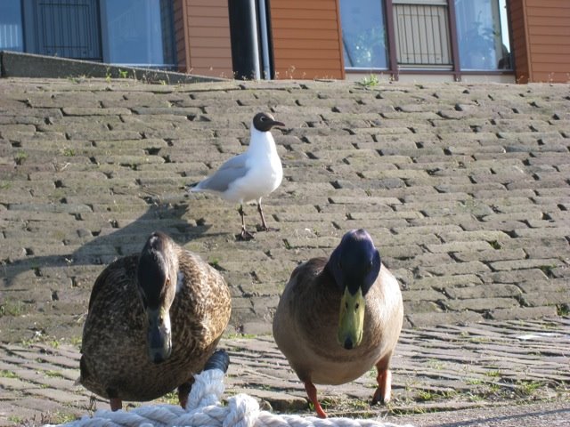 En daar staan waarempel vader en moeder Duck op de kaai. Verwachtingsvol loeren ze over de kaderand in ons schip. Even zijn we bang dat ze, wat al te familiair, ons in de kuip komen begroeten, maar ze blijven keurig op de kaderand staan. Moeder Duck, wellicht bevrucht maar nog niet op haar eieren, is het meest gretig en staat ons smachtend aan te kijken. Haar blik is zo intens dat we besluiten haar pre-eier-toestand te ondersteunen met het spenderen van een (verse) boterham. Het mannentje, vader Duck, blijft bescheiden op de achtergrond om zijn zwangere vrouwtje de ruimte te geven. Een kokmeeuw bekijkt het tafereel vanaf een lantaarnpaal, later op een metertje afstand, in de hoop een stukje brood mee te kunnen pikken. Dat is niet gelukt, mede omdat we eendjes leuker vinden dan meeuwen, die we genoeg hebben gezien op de reis naar Noorwegen.