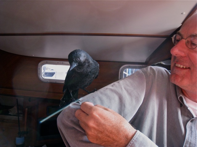 Na Leeuwarden stonden we voor de keus, linksaf binnendoor langs Grouw naar Sneek of rechtsaf naar Harlingen en nog even naar de eilanden. De laatste optie leek ons gezien de weersverwachting het aangenaamst. Vroeg in de middag voeren we al weer op het zout, en 3 uur later waren we na een schitterende zeiltocht op Vlieland. Net als bij Schiermonnikoog worden we bij de haven begroet door een zeehond die ons nieuwsgierig aankijkt om vervolgens onder water te duiken. We waren nog niet in de nieuwe haven geweest en het aanleggen op de nieuwe steiger ging niet vlekkeloos. Nu weten we hoe het er uitziet en zijn we beter voorbereid voor de volgende keer. Het zonnetje schijnt, de wind waait uit het zuiden. Terwijl ik aan het telefoneren ben staat plotseling een kauwtje op de drempel naar de roef. Hij kijkt of er iets te halen valt en besluit de roef aan een nader onderzoek te onderwerpen. Voordat ik er erg in heb zit hij op mijn arm en even later op mijn schouder, hevig geinteresseerd in mijn oor. Hij pikt in mijn oor alsof er iets lekkers te eten is. Ik ben er niet direct enthousiast over en probeer hem af te leiden en zijn aandacht op iets minder gevoelige plekken te richten. Het brillekoordje achter mijn oor is haast even interessant, iets minder gevoelig maar ook niet bepaald prettig. Het volgende doelwit is mijn mond, waar hij hoopt nog een broodrestje tussen mijn tanden weg te pikken. De havenkauw is bepaald niet bang en het kost me moeite om hem ervan te overtuigen dat er hier niets te halen valt. Met zachte dwang posteer ik het vogelbeest op mijn arm en loop met hem naar de kuip. Met een zwierige zwaai, zoals ik het een valkenier ooit zag doen, werp ik het kauwtje in de lucht, waarop hij handig de landing op de naburige boot inzette. Even later verdwijnt hij bij de buren in de kajuit. Als geschenk laat hij bij ons een wit poepje achter vlak voor de kajuitingang.