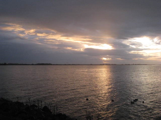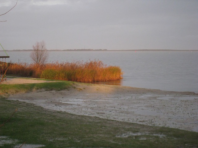 De opkomende zon probeert met enige moeite onder de laag-hangende bewolking de Makkumerwaard te beschijnen. In het Westen beloven de grijze wolken een regenachtige dag. Het is grauw en grijs in het park. De huisjes zijn spaarzaam bezet, slechts hier en daar staat een auto op de oprit, als bewijs van menselijke aanwezigheid.