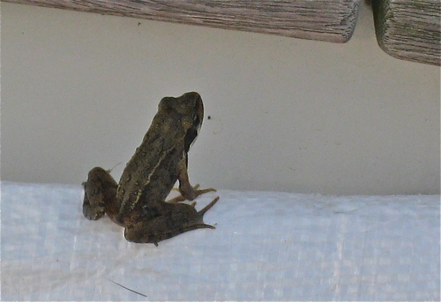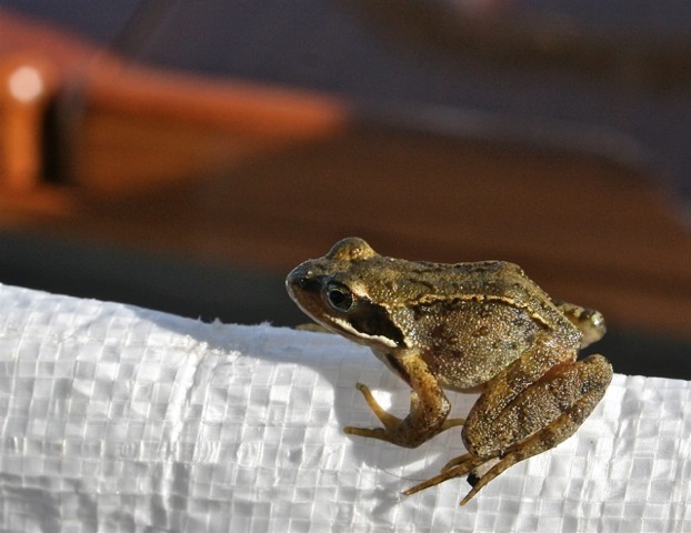 Hoe heeft dit minikikkertje, we doopten hem direct tot ‘Flip’, het voor elkaar gekregen om in onze kuip te komen? Kikkers kunnen goed springen maar om vanuit het water met een ferme afzet van zijn zwempoten meer dan anderhalve meter omhoog te springen lijkt ons een godswonder. Het was geen godswonder. De zwemtrap hing nog uit van de dag van gisteren, de toegangsweg vanuit het water naar boven voor Nienke. Het kan niet anders dan dat onze Flip hiervan gebruik heeft gemaakt om daarna zijn hoge plek bij de bakskist in te nemen om zo de wereld eens van een andere kant te bekijken. Als ik me probeer voor te stellen hoe Flip van sport naar sport de ladder heeft beklommen, kan ik niet anders dan grote bewondering voelen voor zijn prestatie. Omdat de ladder loodrecht naar beneden hing heeft hij toch rare sprongen moeten maken, sprongen die me doen denken aan het bestijgen van die bewegende trap van een kermisattractie. Of heeft Flip zuignappen aan zijn pootjes waarmee hij zich vast kon zuigen aan het gladde roestvrij staal van de zwemtrap? We zijn trots op Flip al zit er dankzij zijn prestatie geen huldiging door de grachten van Lemmer in want we hebben hem na een loflied gezongen te hebben weer te water gelaten, zodat hij zijn broertjes en zusjes aan de kant, die zich gisteravond luid kenbaar maakten, over zijn avonturen kan vertellen.