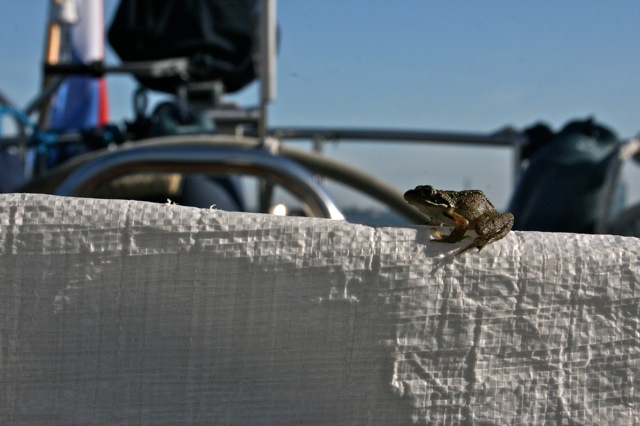 Langzamerhand komen we in het ritme van het bootleven. ’s Morgens redelijk op tijd opstaan, wat poedelen, scheren (alleen ik) en tandenpoetsen, even kijken of er nog voldoende stroom in de accu’s zit en dan een ontbijtje met muesli en fruit. Dat deden we vanochtend ook. De luiken gaan in de beschermhoes en een eerste verse blik en eerste snuif frisse lucht worden respectievelijk naar buiten geworpen en opgesnoven. Nienke slaakt een kreet als ze de kuip in stapt; er zit een kikkertje in de kuip op de slordig achtergelaten lege hoes van het tafeltje achter op de bakskist.
