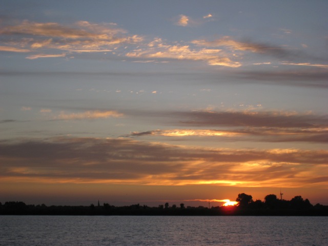 In de verte hoor ik de schrille kreet van een meeuw, de wind is aan zijn avondslaapje begonnen, een zeilbootje probeert nog dat laatste beetje wind te benutten om de overkant te halen, z’n rustplaats voor de nacht.
