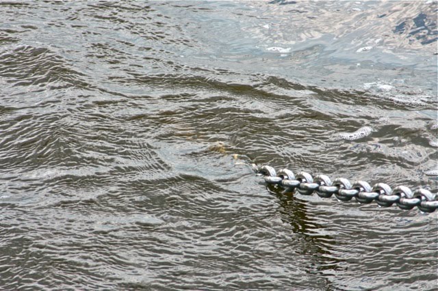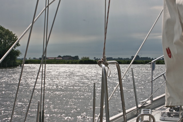 We zijn verslaafd, verslaafd aan een plek, een waterplek om precies te zijn. Wat is er mooier dan alleen met je scheepje voor anker te liggen op een meertje? De zuidwesten-wind blaast door het want dat in de vlagen een aanzwellende fluittoon produceert terwijl Nika onzichtbare zigzaglijnen schrijft in de golven achter het anker. Het fluiten wordt in de hardste vlagen begeleid door het geroffel van de veiligheidsbanden op het dek. We voelen ons geborgen in de wetenschap dat we een goed anker hebben dat zich diep in de modder heeft ingegraven.