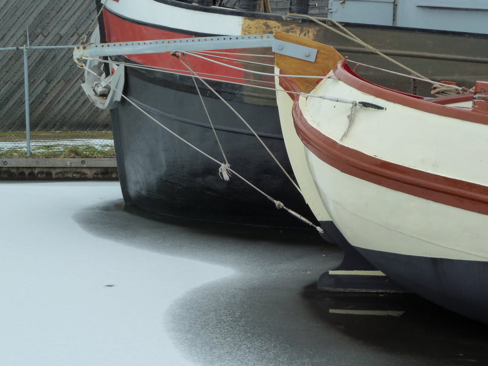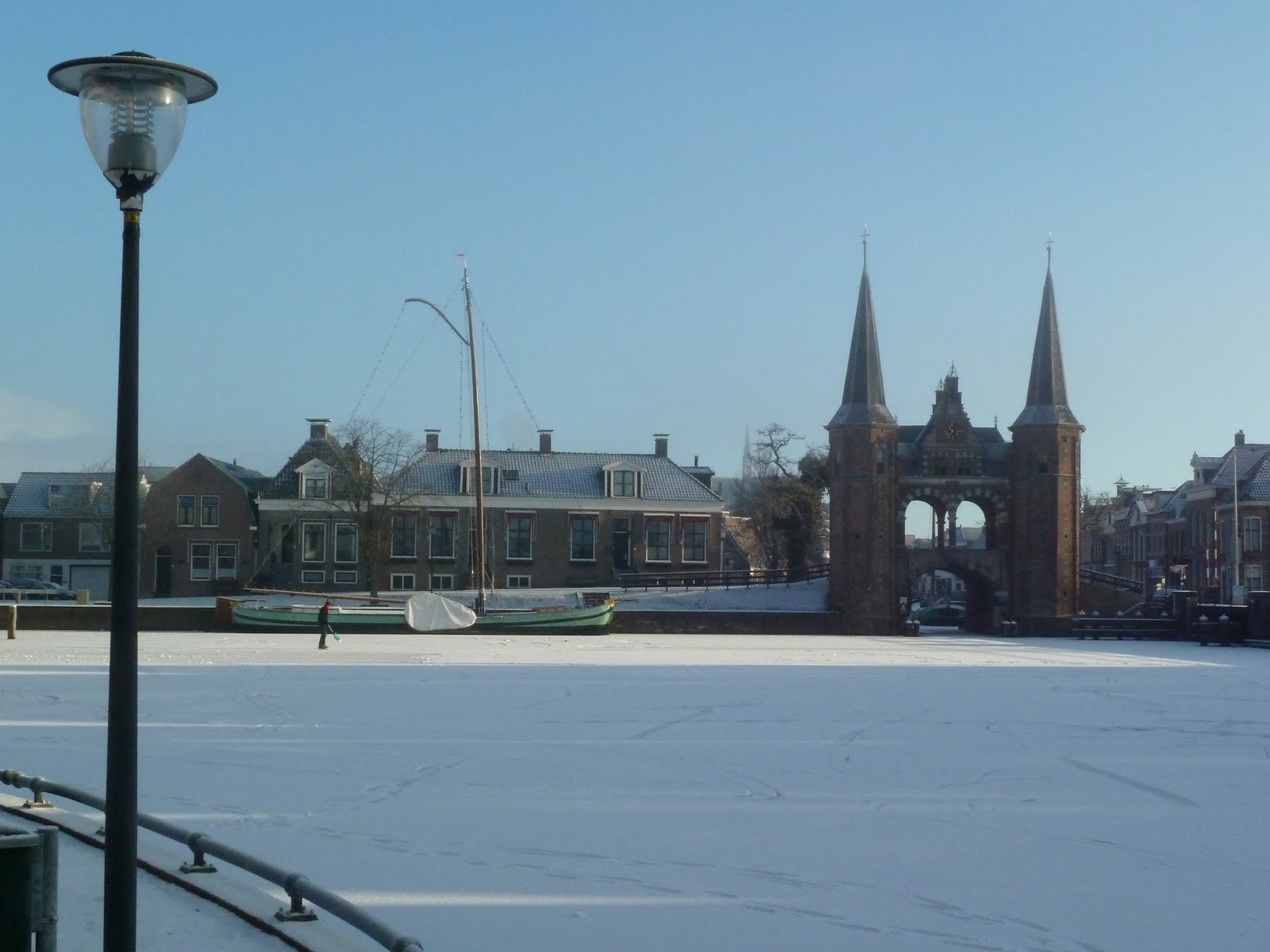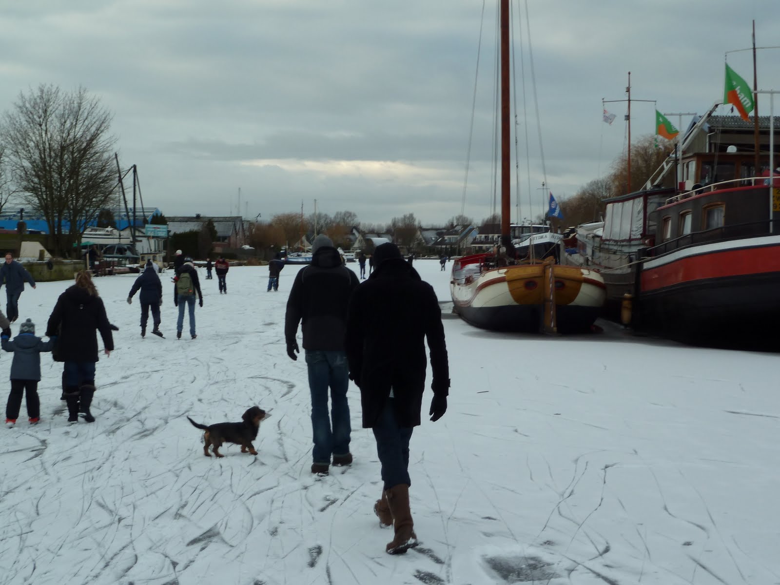 Ja,dat kan als je aan het water woont. De voordeur open en met in de woon-kamer al onder gebonden schaatsen de weg oversteken, bijna struikelen over het lage hekje en dan voorzichtig op het tot ijs getransformeerde water stappen. Een beetje eng,vooral als nog niemand voor je over het ijs is gegaan. Toen wij de ijzers onder bonden (helaas waren we vergeten ze te laten slijpen) waren er gelukkig al een paar eerstelingen onze voordeur gepasseerd. Een dun laagje sneeuw verhult de bobbels en de scheuren zodat we bepaald onbezorgd de benen uitslaan. Het valt ons mee, we komen redelijk vooruit en verder op wordt het schaatsgenoegen alleen maar beter als ook de sneeuwlaag door de wind blijkt weg geblazen, een spiegelgladde ijsvloer strekt zich uit voor ons. Zwierend glijden we over de Geeuw richting IJlst. Een waterig zonnetje doet zijn best om door de nevelige winterwolken het onderland te belichten. De landerijen zijn wit van de sneeuw, de spaarzame bomen en struiken langs de Geeuw wit berijpt.We genieten van de omgeving die zich zover het oog reikt van haar mooiste kant laat zien. Bij IJlst slaan we na de Molen links af het vaartje in, waar we moeten klûnen bij de brug.Vandaar rijden door naar de Wijde Wijmert. Het ijs is even van mindere kwaliteit door de verwaaide takjes riet en door de wind opgeworpen ribbeltjes. Naar IJlst ‘om de west’ is het ijs weer prachtig en we wanen ons op ijs dat zojuist is geprepareerd voor een WK. Vóór de brug lijkt het ijs niet vertrouwd, de optie om 300 meter te klûnen verwerpen we en we keren om op onze glij-ijzers en nemen de dezelfde weg terug.Er staat vrijwel geen wind en we horen alleen het krassen van de schaatsen. Op de Geeuw is het nogmaals genieten, als we steeds beter in balans op Sneek afstuiven, langs de eendjes en de meerkoeten die een groot wak openhouden bij het aquaduct, langs het schoongemaakte ijsveldje van een paar enthousiaste ijshockeyers, langs de ‘koek en sopie’ van een paar slimme jonge ondernemers en langs een kindje dat ondersteund door haar moeder op haar dubbelijzers probeert overeind te blijven.Vreemd idee daar waar we anders varen, ‘lopen we schaats’ over het ijs. Zal het deze winter er toch dan weer een keer van komen? Een elfstedentocht langs onze voordeur? We zijn er klaar voor, de stoelen op de kade, een pan met warme chocolademelk op het vuur, zicht op de stempelplaats, wat wil een mens nog meer?
