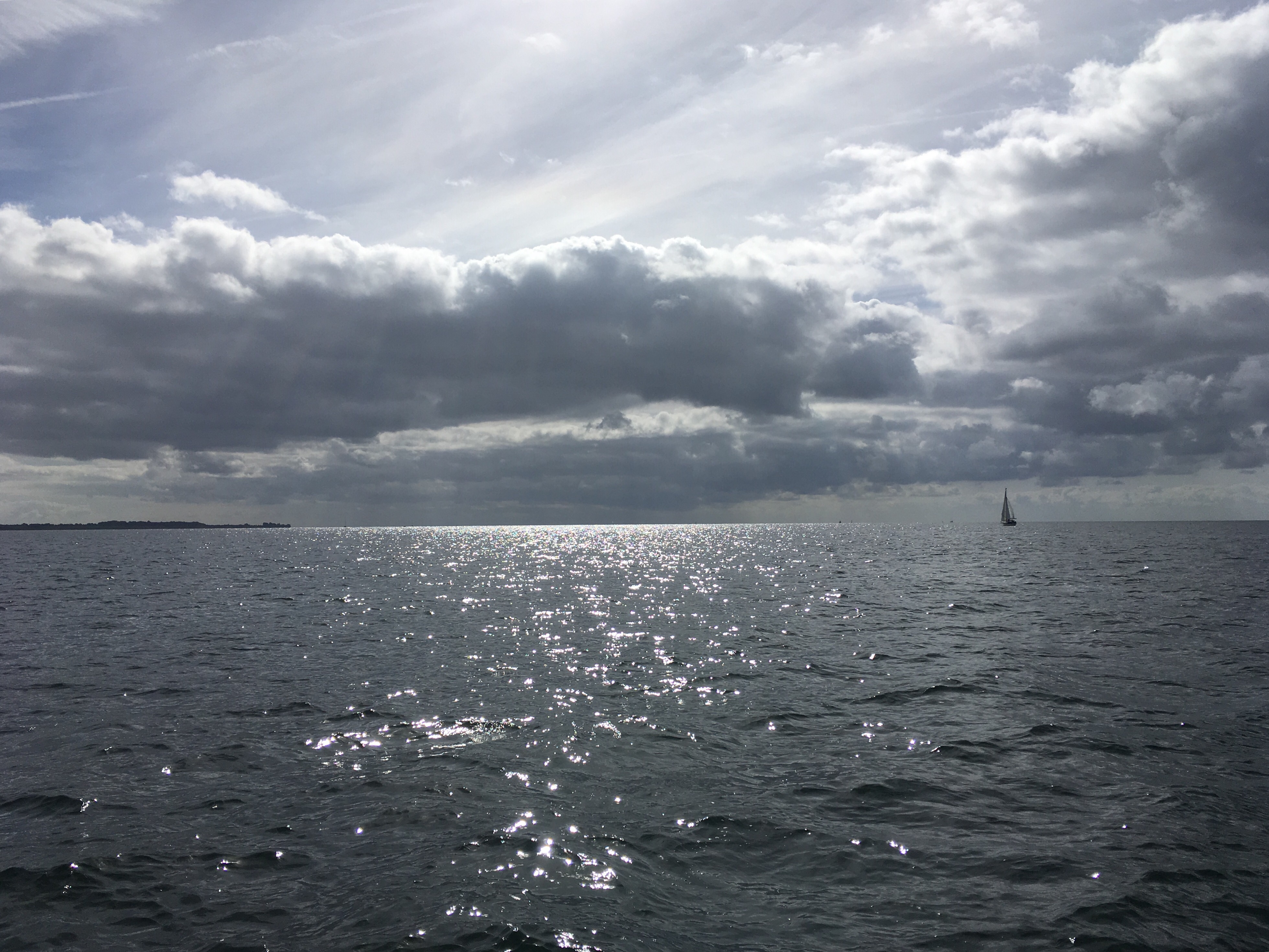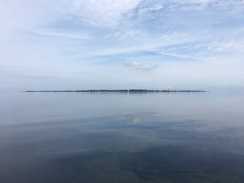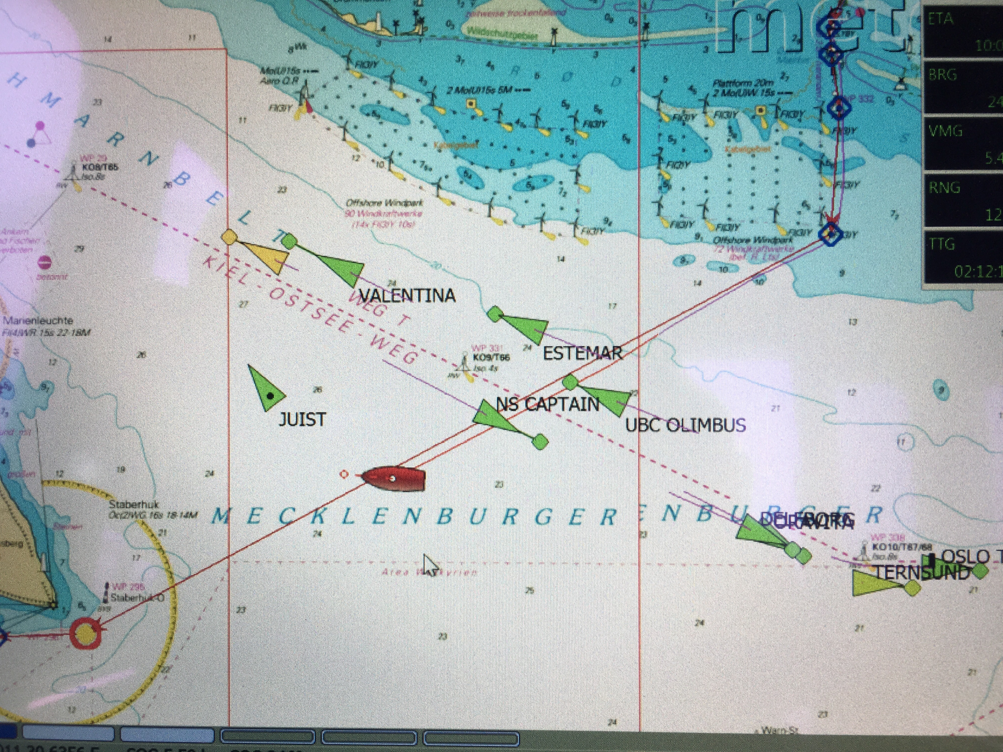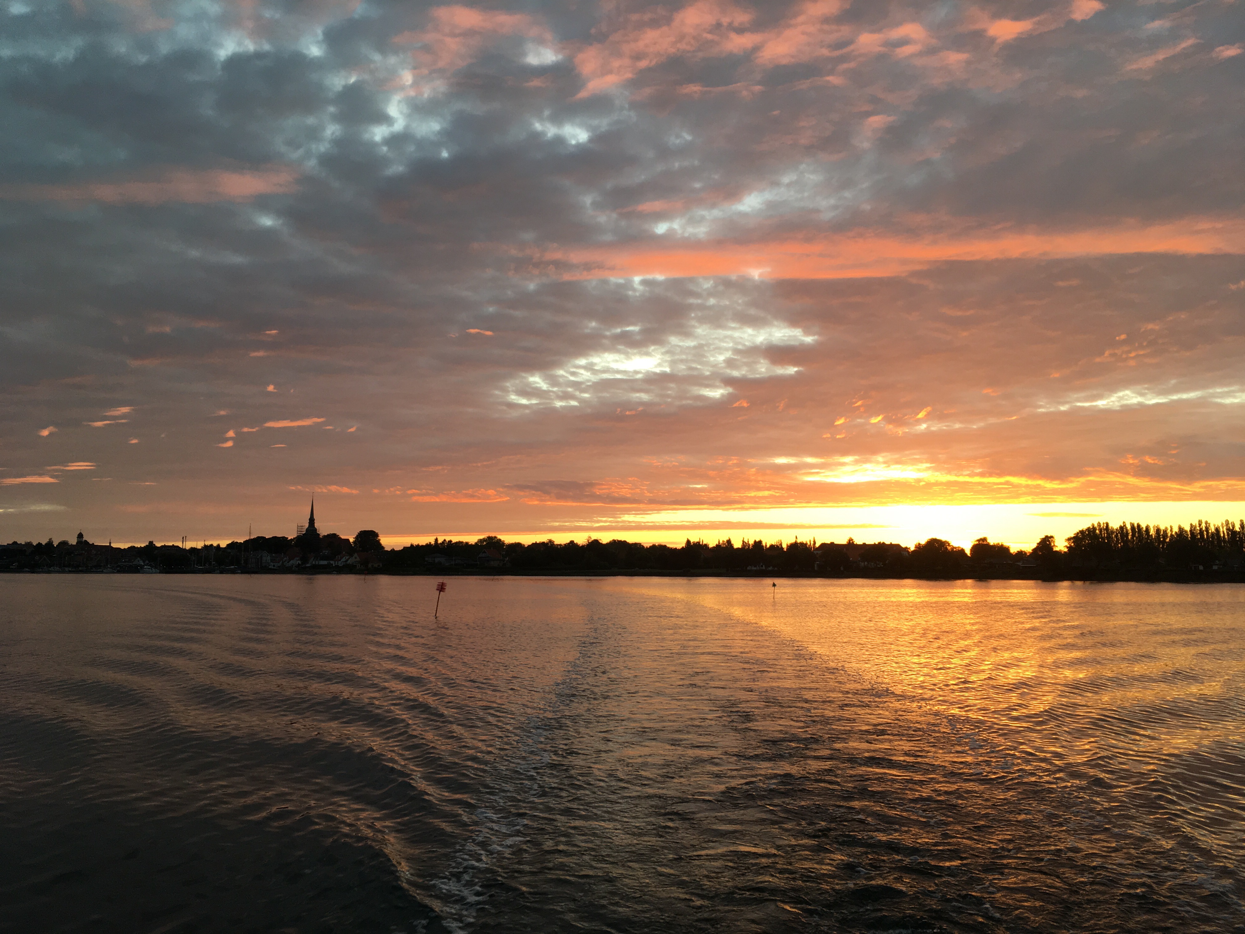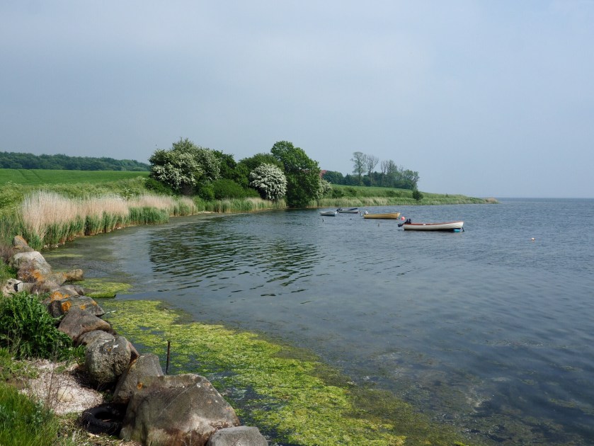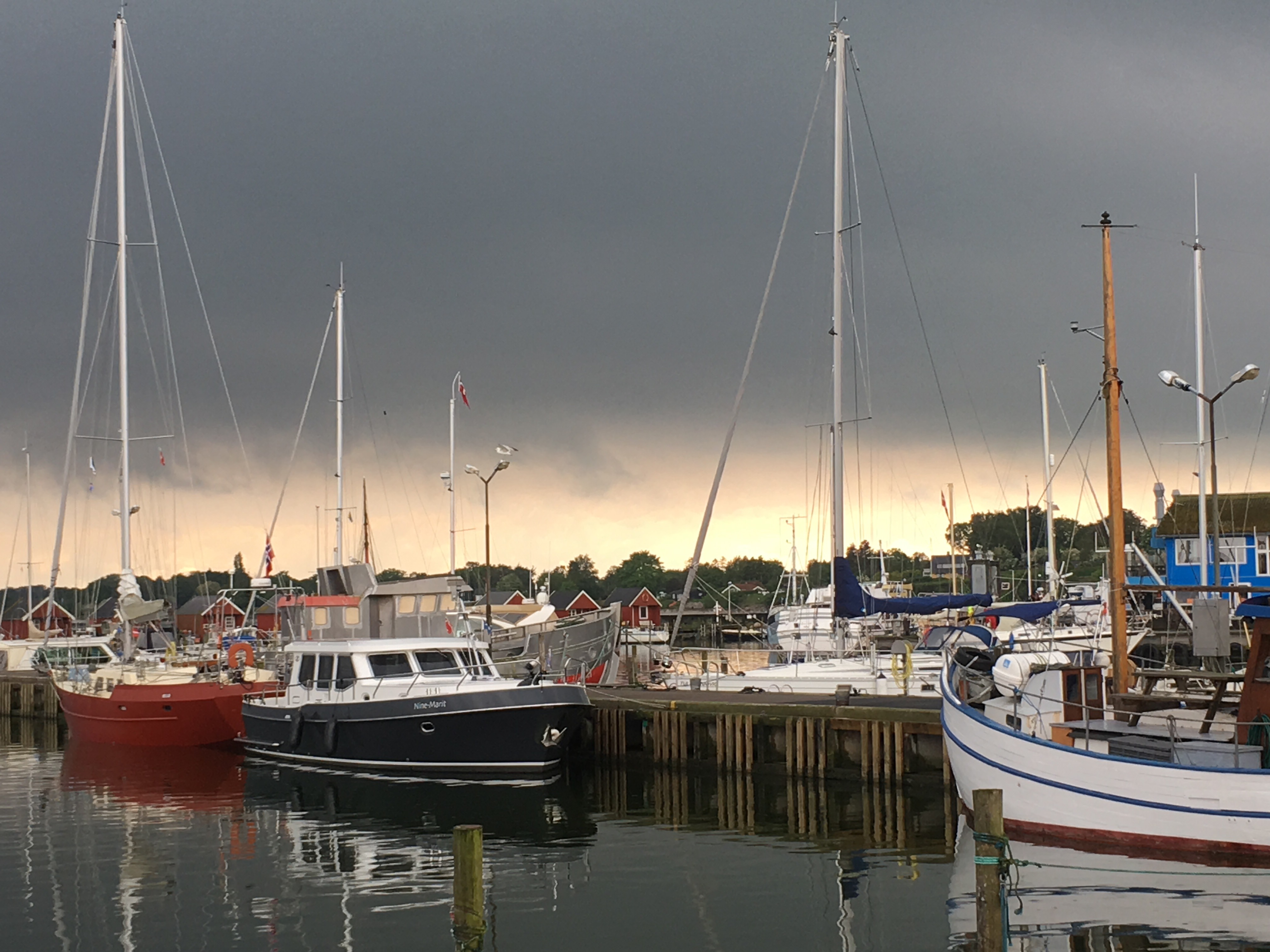 Een zegen voor de boeren, het regent eindelijk. De wind waait vlagerig met 20 knopen uit het oosten. Geen zegen voor ons. We zijn gevlucht. De harde wind zat. Uit ons lijf gerukt. Het geusje staat strak-wapperend dwars op de voorplecht. Gisteren zijn we, toen het even rustiger werd, van Fehmarn overgestoken naar de vaste wal. Een snoepreisje over een bijna gladde zee. Bij Travemünde voeren we naar binnen, de Trave op. In een klein haventje waar de havenmeester zich niet liet zien, laat staan aanwezig was, hebben we een nachtje gratis langszij aan een prima steiger gelegen. De Trave is prachtig, ze doet ons nog iets meer denken aan de River Deben( dat denken we nogal vaak).