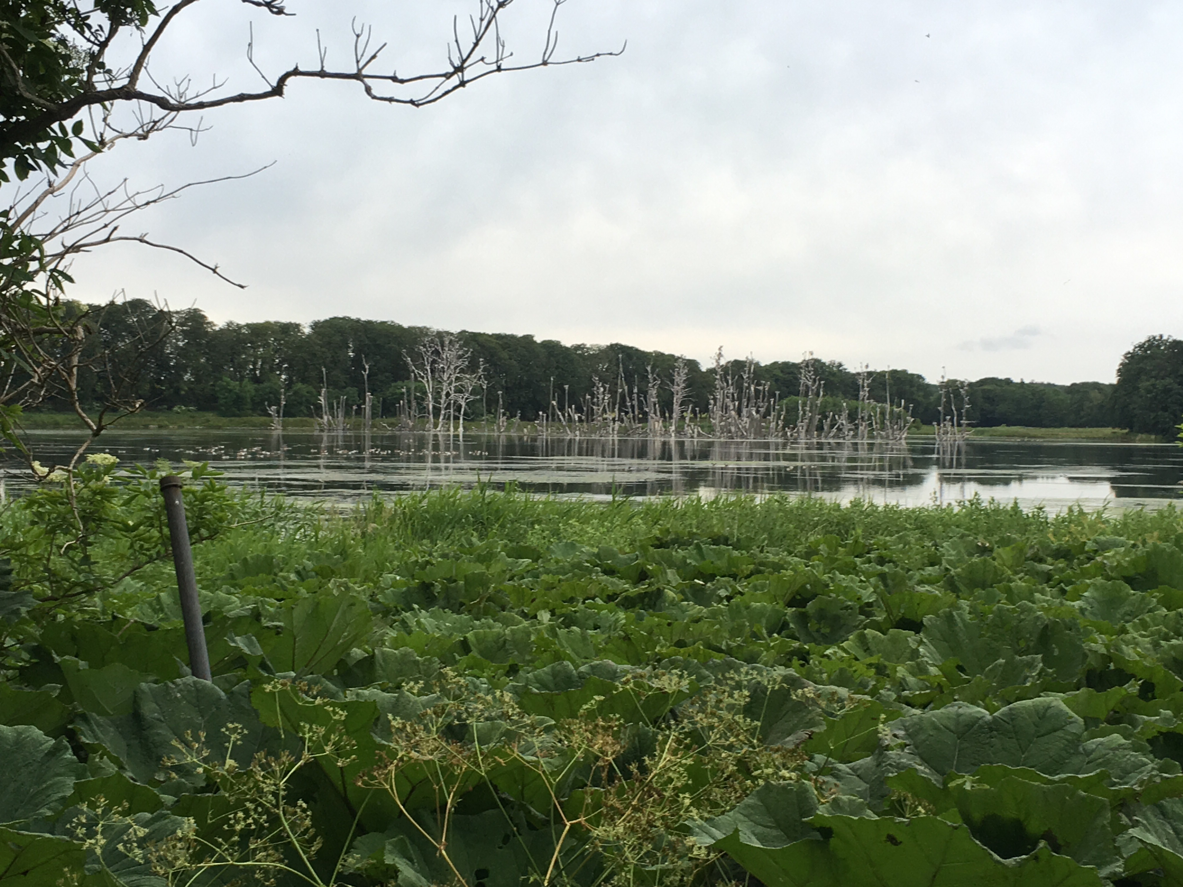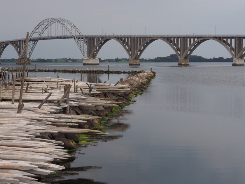 Af en toe plenst het kortdurend met dikke druppels die bellen blazen boven het wateroppervlak. Aan de overkant horen we in de lange roodbruine loods iemand zijn best doen een drumstel in elkaar te slaan. Het lijkt alsof iemand met een gitaar probeert wat onduidelijke klanken er aan toe te voegen. De plens-regen wint het qua volume van de drummer. Af en toe passeert een verlengde Canadese kano met daarin een veertiental zwoegende peddelaars die als galeislaven, in een dubbele rij, op het ritme van de trommelslager in de voorpunt, proberen de vaart er in te houden. Even later, haast nog sneller, passeert opnieuw een kano, ditmaal met zwaar-peddelend vrouwvolk, aangevuurd door een struise roerganger die op operasterkte een soort ritmische oerwoud-kreten te berde brengt. Als die twee een wedstrijdje gaan doen wed ik dat de dames winnen. Terwijl al dit aardigs voorbij vaart, blijkt de overkant een geliefkoosd hardloop pad, waar van alles voorbij wipt. Het zou me niet verbazen, als straks ook nog een rondvaartboot voorbijkomt, aangedreven door driftig waterfietsende toeristen. Alles in het kader van duurzaam bewegen en gezond recreëren.