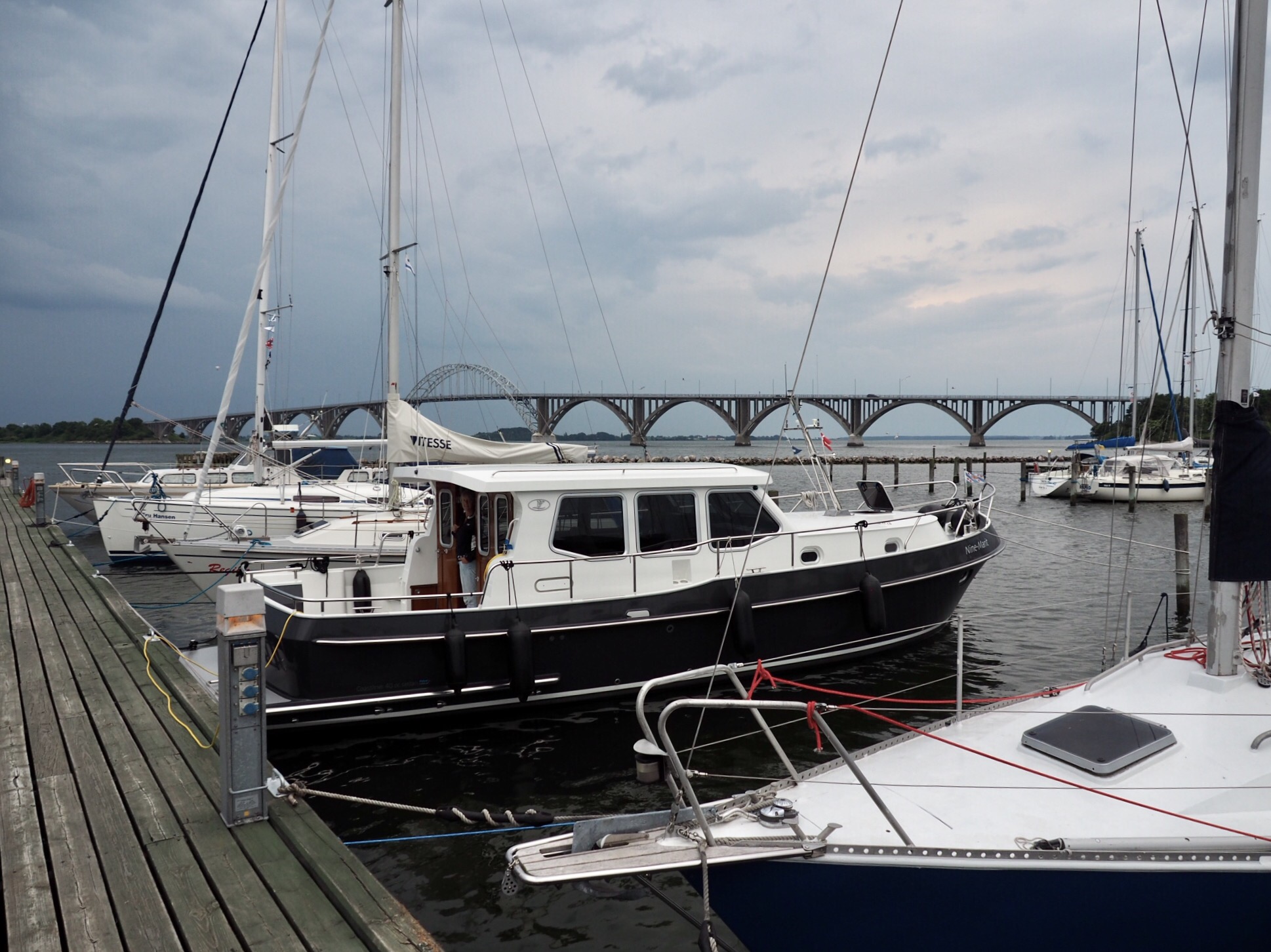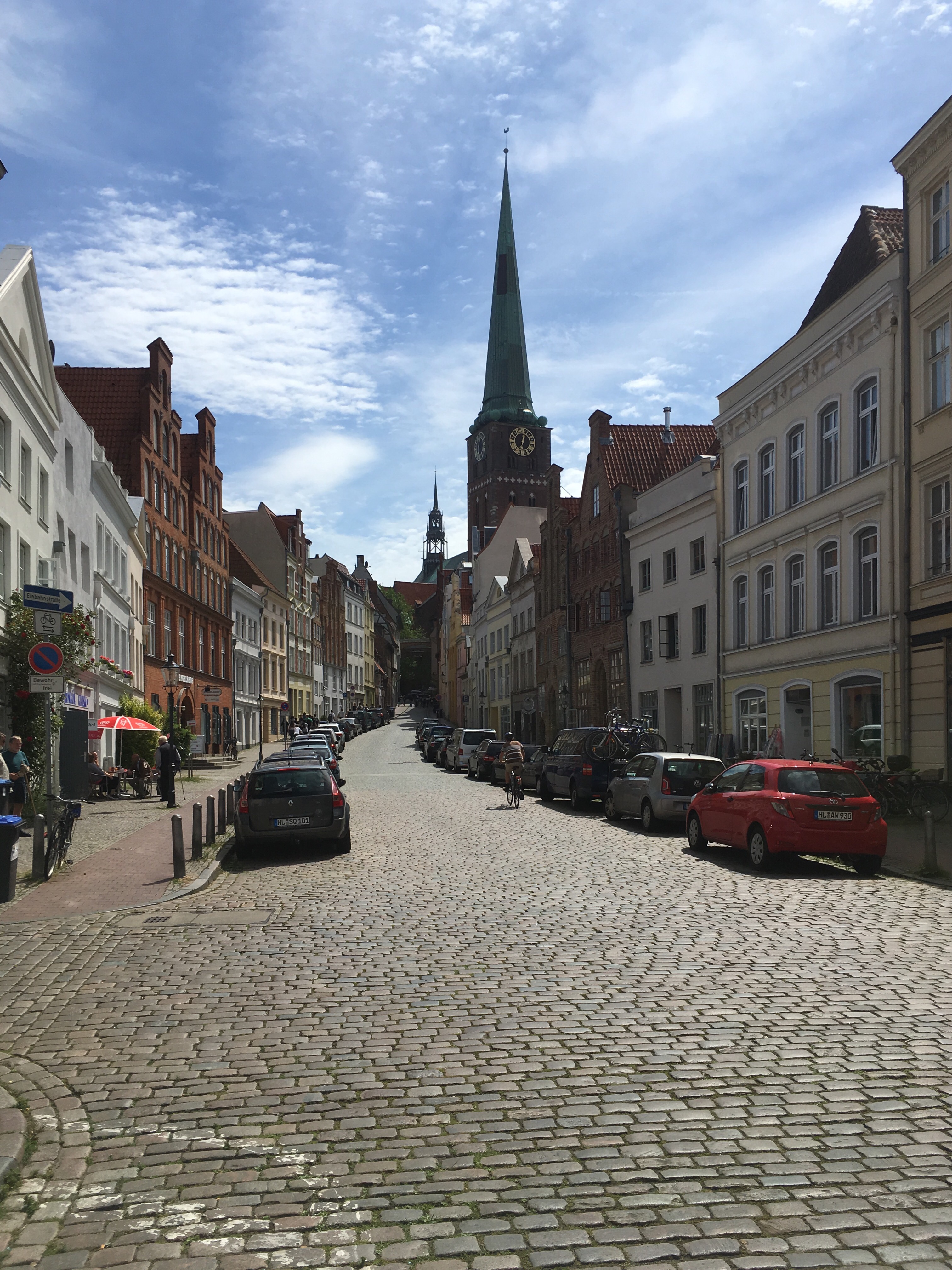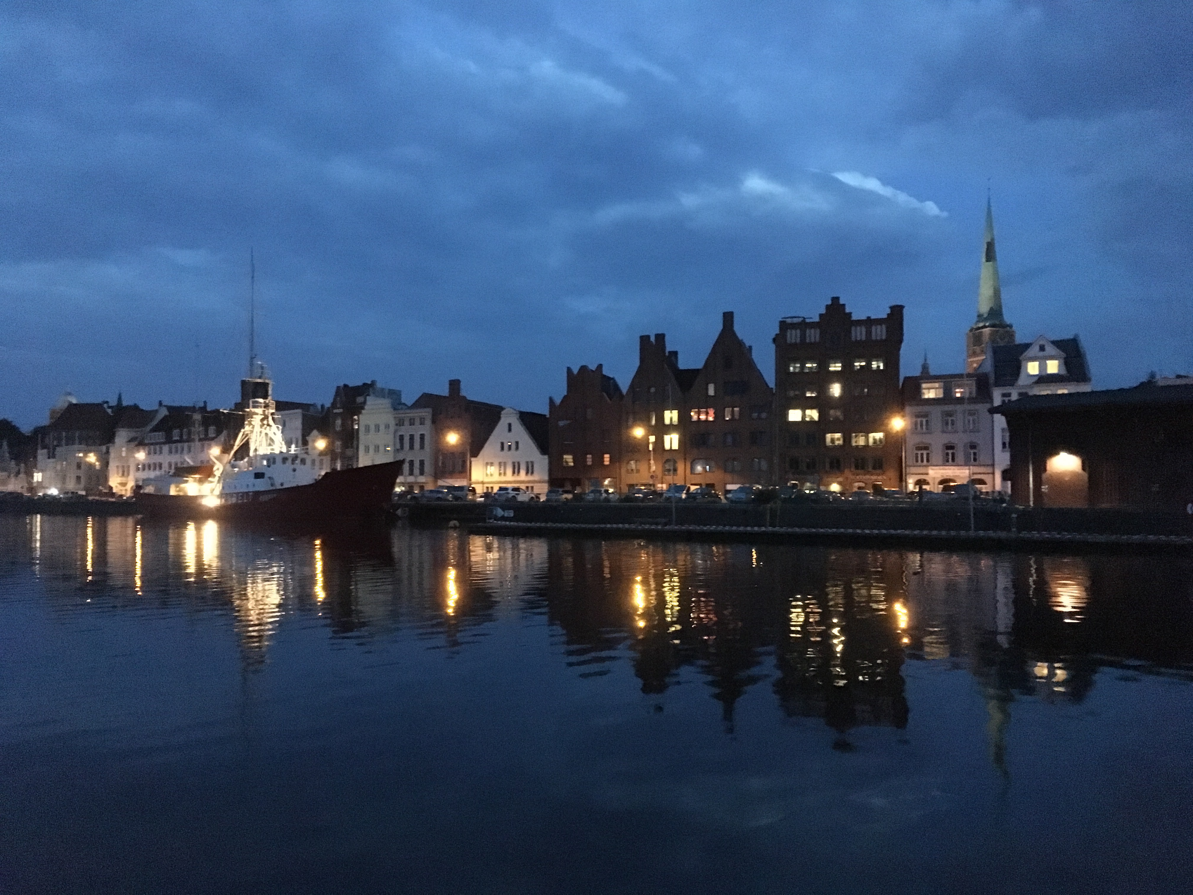 Vandaag voeren we verder en daar waren we zomaar in Lübeck zelf. Wel luxueus, om midden in Lübeck in een nieuwe jachthaven verwelkomd te worden, waar de licht- loensende havenmeester, duidelijk in zijn sas omdat de nieuwe haven net geopend was, ons uitgebreid voorlichtte over wat er allemaal in Lübeck te beleven is. Dat er nog geen drinkwater op de steiger is, lag aan de gemeente, die eerst terugslagkleppen op de leidingen gemonteerd wilde hebben. De bijbehorende uitleg kon de havenmeester niet geven, waarschijnlijk omdat hij de achterliggende techniek eveneens niet helder had. Vanwege dit ongemak bood hij aan om bij gebrek aan water zijn neefje water te laten brengen in twee 20 liter tanks. Het aanbod hebben we voorlopig afgeslagen. Om het neefje te sparen. We liggen riant aan een vingersteiger waar de middenbolder ontbreekt. Foutje van de aannemer, die volgens de ontwerper van de haven, hij kwam even langs, een Hollander is. Die kunnen het beste vingersteigers maken, van aluminium en hout op een drijfdoos van plastic.
