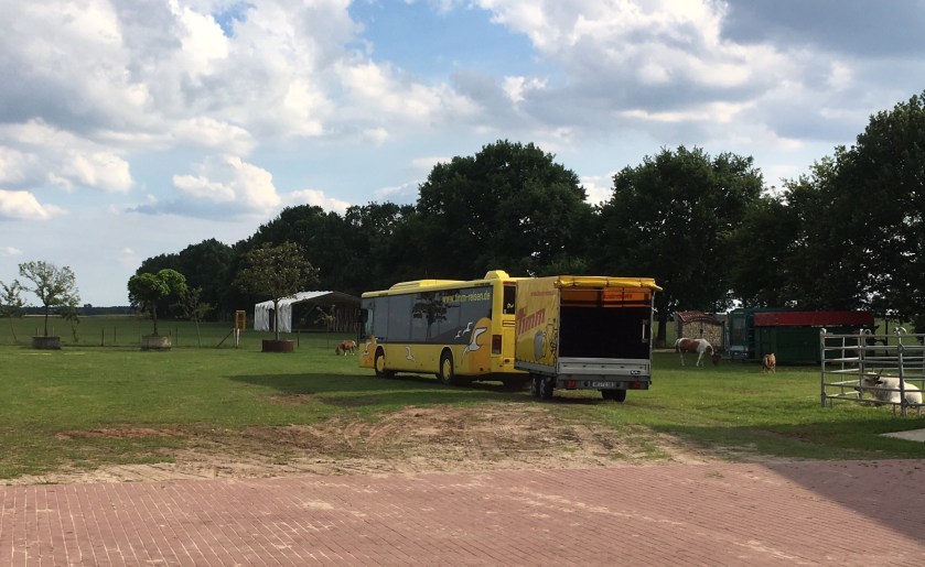 Handig stuurt ze de grote autobus met aanhanger over de smalle wegen bij Bad Bodenteich. Ze kijkt strak voor zich uit en ik twijfel of ze het wel goed vindt als ik haar aanspreek. Afgemeerd aan het Elbe Seitenkanal, maken we een trip met de bus naar Uelzen. Heen met de de gewone bus, terug met de Entdeckerbus die gratis een rondje maakt in dit glooiende landschap rond Ülzen. Cadeautje van de provincie. Tussen de bossen zien we velden met bloeiende aardappelplanten en verschillende bijna rijpe graanvelden. Ze had al gedacht dat we bootjesmensen waren. Zelf heeft ze ook een motorboot, ‘ Erica Babe’, in Nederland gekocht. Ik vertel haar dat we graag afgezet willen worden in de buurt van het kanaal waar ons schip ligt. ‘ Kein Problem’, maar eerst wil ze ons nog wat laten zien. We zijn de enige overgebleven passagiers nadat de laatste mensen bij de camping waren uitgestapt. Bij een vriendelijke uitspanning waar gastronomisch gegeten kan worden slaat ze met bus en aanhanger links af en rijdt het erf van de boerderij erachter op. Of ik maar even het hek wil openen en oplet dat de paarden niet naar buiten lopen. Tot mijn verbijstering rijdt ze met de bus de wei in daarbij een paar nerveuze paarden ontwijkend en maakt een rondje zodat ze met de bus met aanhanger de poort weer uit kan rijden. De bus gekeerd mag ik weer instappen en worden we door Bettina, zo heet ze, bij de weg naar het kanaal afgezet. Het was een onverwacht stukje reclame voor deze eetgelegenheid in de buurt. Lachend nemen we afscheid van Bettina die ons ook nog even een paar tips geeft over de volgende haven die we van plan zijn aan te lopen.Het Plaatsje Uelzen is een echte Hanse stad. Het aantal oude gevels is minder talrijk als op het internet wordt gesuggereerd. Het ziet er in de hoofdstraat wel gezellig uit. De terrassen zitten vol met ijs etende mensen . ‘Gott’ twittert er lustig op los met in het hout boven de deurposten gebeitelde spreuken. Meestal van de moraliserende soort. Boven een wijn- en drankwinkel stond dat dronkemannen niet hoeven te rekenen op een plaatsje in de hemel. Spreuken in de trant van eerlijk je brood verdienen maakt je gelukkig en bezweringen dat huis en bewoners gevrijwaard mogen blijven van ziekte en armoede zijn er in vele variaties.