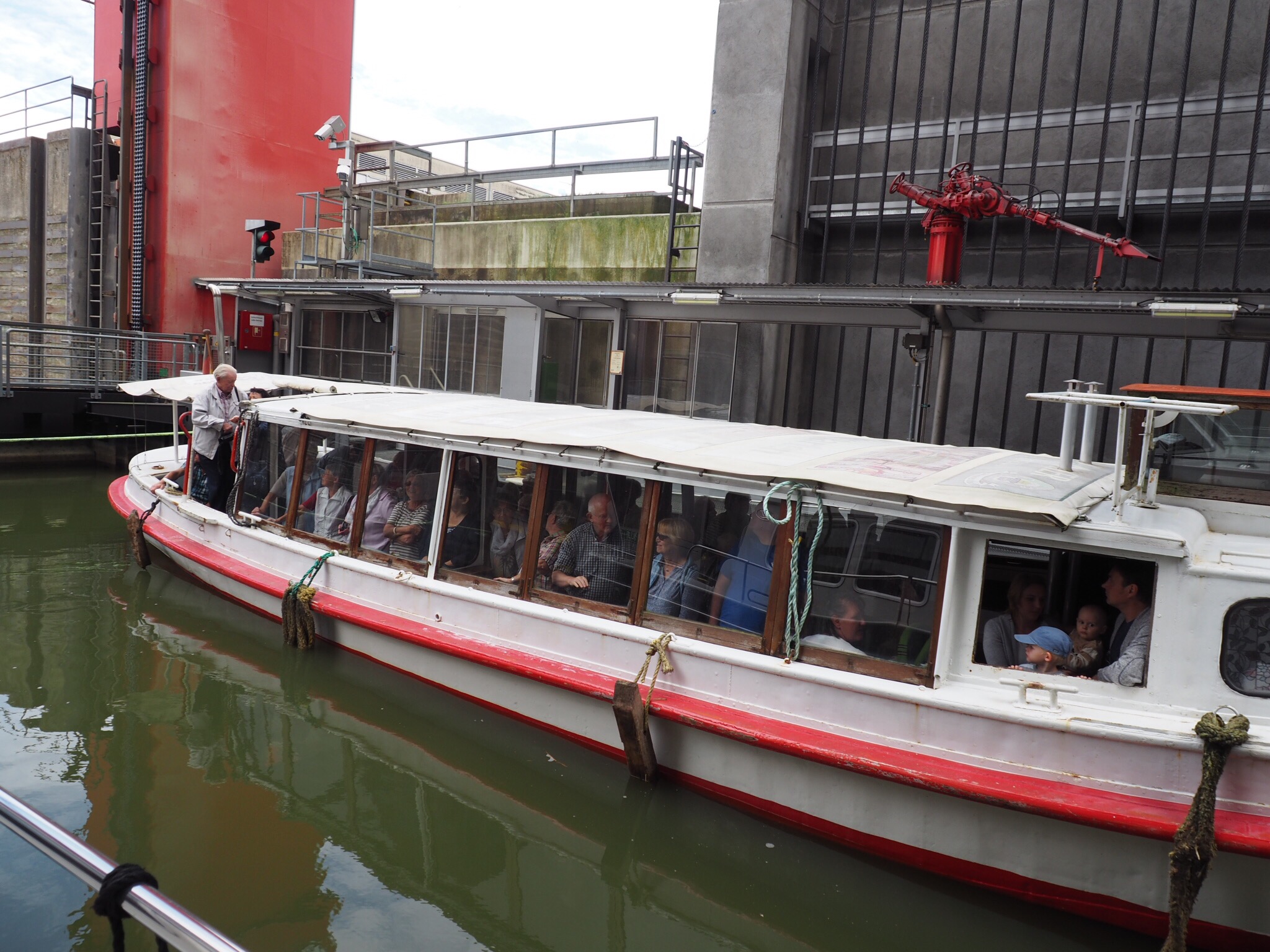 Toen de Muur tussen Oost en West Duitsland werd gebouwd in het begin van de jaren 60, veranderde de Elbe in een Grensrivier. Het scheepvaart-verkeer werd een probleem. Als antwoord is het Elbe Seitenkanal gegraven. Het Kanaal waar we nu op liggen met de Nine Marit. Omdat het kanaal over de Lünenburgerheide loopt moest een flink hoogteverschil overwonnen geworden. Daarvoor is een Hebewerk geconstrueerd waarin schepen in gigantische waterbakken 38 meter omhoog of omlaag getakeld worden. Tijdens onze tocht omhoog lagen we in de bak achter een groot binnenvaartschip. Naast ons een vol geladen gammele rondvaartboot. Nieuwsgierige dagjesmensen loerden naar ons en wij naar hen. De rondvaartboot ging omhoog met het Hebewerk voor de lol en niet om verder door te varen. Toen we met zijn allen boven waren en naar buiten voeren draaide de rondvaartboot voor onze boeg om en dook de bak weer in om de terugreis naar beneden te maken. Omhoog en omlaag zoals we vroeger voor de lol met de roltrap in V en D naar boven en naar beneden gingen. Bij het naar buiten varen werden we enthousiast uitgezwaaid door de passagiers aan boord van de rondvaartboot.