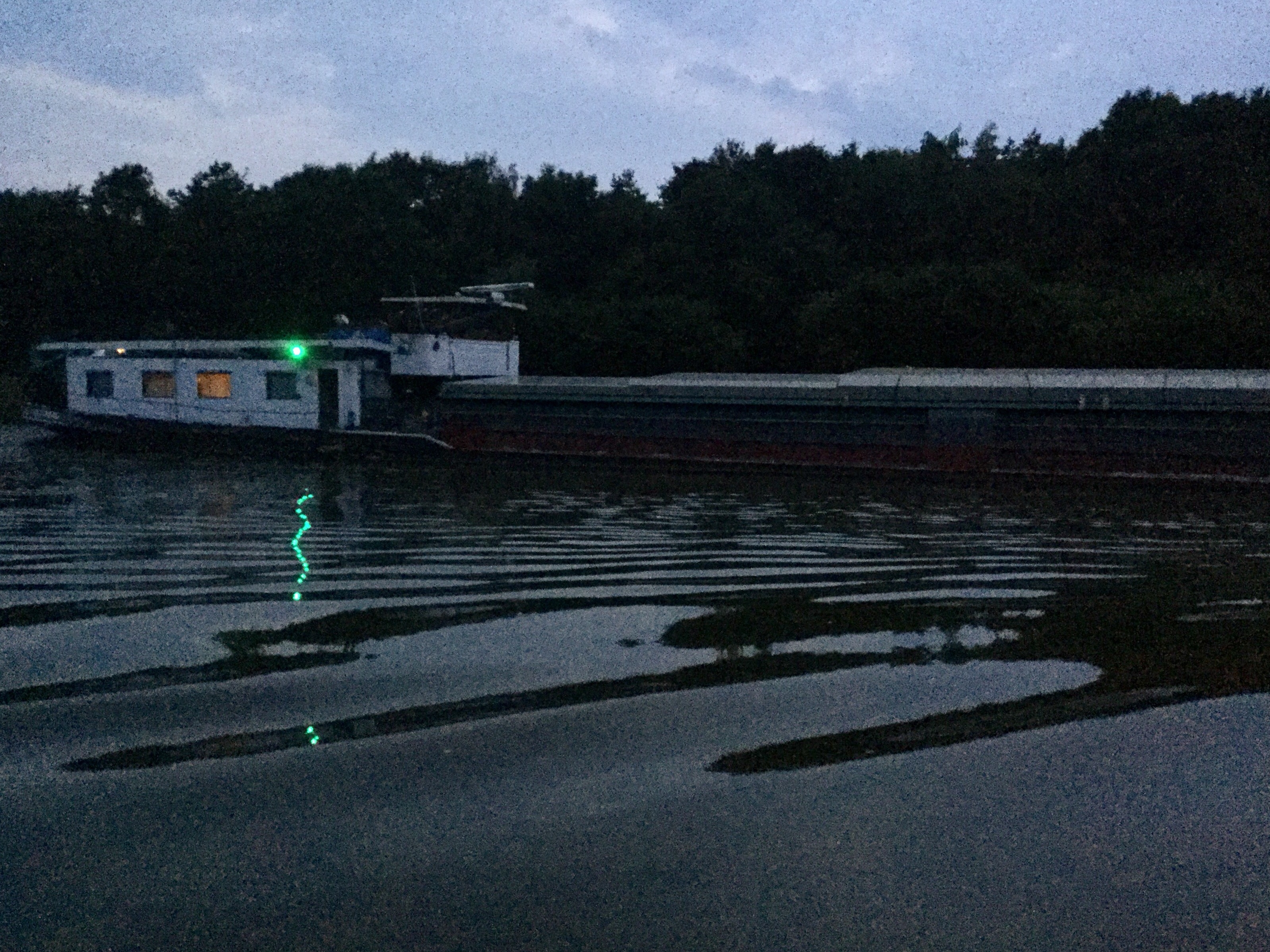 In dit haventje, halverwege het Elbe-Lübeck Kanaal liggen we heel rustig tussen de bomen. Als ik achter het schip in het water kijk, zie ik dat we met de achterkant van het schip vlak bij een ondiepte liggen. Die heb ik bij het achteruitvaren niet gezien, maar ook niet geraakt. Geluk is soms met de onwetenden. De stortbui van daarnet heeft plaats gemaakt voor de opgewekte avondzang van twitterende merels…..