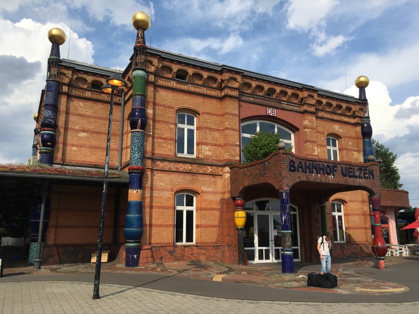 Vanuit het oude centrum lopen we richting het station. Eerst lopen we fout langs een laan met grote huizen en een snelstromend beekje waar diverse gezondheidsbevorderaars en zieleknijpers hun domicilie hebben met de ‘Praxis’ aan huis. Na enig vragen hoe we moeten lopen komen we uiteindelijk bij de ‘schönste Bahnhof in der Welt’. We hadden erover gelezen en dan wil je het bekijken. Het Station, gebouwd in 1897, was eind 20e eeuw in verval geraakt en moest nodig gerestaureerd worden. Voor de wederopbouw met een extra accent werd de Oostenrijkse architect en kunstenaar Friedensreich Hundertwasser aangetrokken om er iets aparts van te maken. Dat is hem aardig gelukt zo vlak voordat hij het loodje legde in 2000 aan boord van de Queen Elisabeth II ergens onderweg op zee in de Pacific. 72 jaar heeft zijn hart getikt, een keur aan artistieke werken achterlatend. Het is een apart gebouw geworden, oud Duits-strak in het hoofdgebouw, maar opgeleukt met gouden bollen, kleurrijke pilaren en allerlei beweeglijke grapjes in de gevels en gangen onder het spoor door. We vonden het wel aardig en zeker verrassend, maar het centraal station in Amsterdam is echt indrukwekkender en mooier.