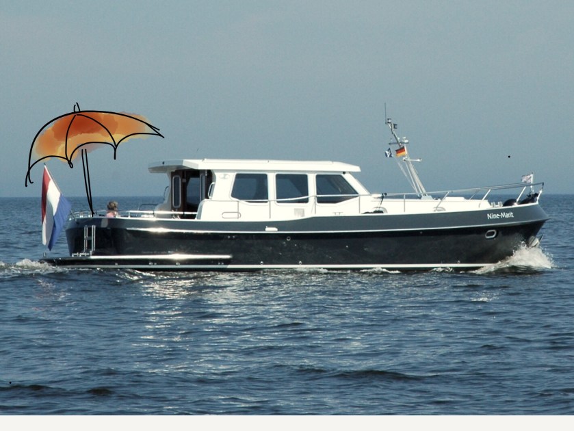 Nine Marit heeft als een Gooise vrouw een zonnebril op haar hoofd gekregen, iets verder naar achteren als de meeste zonnebrillen op de hoofden van vrouwen die hun dure merkbril willen showen. Maar het moet gezegd het staat haar goed. De bimini voegt iets toe waardoor ons schip completer lijkt. De kuip komt in de schaduw en geeft het gevoel alsof je op een veranda zit. Een schommelstoel is niet nodig, schommelen doet het schip zelf wel.