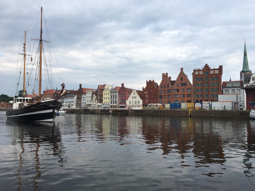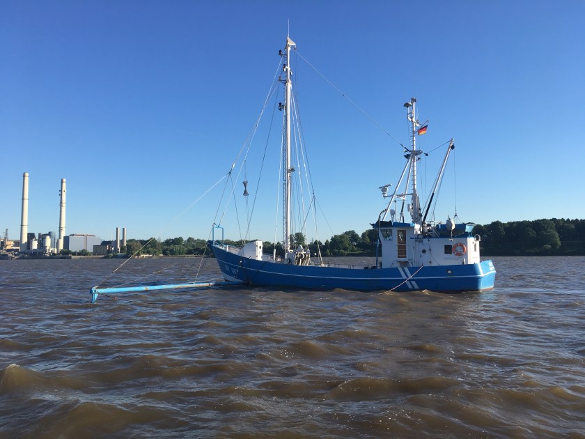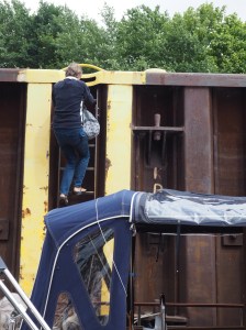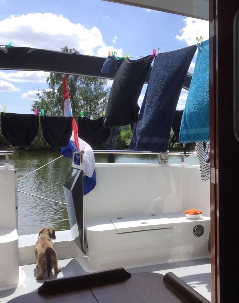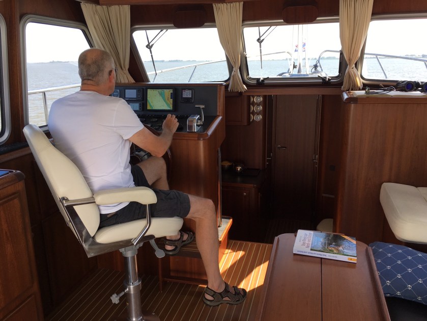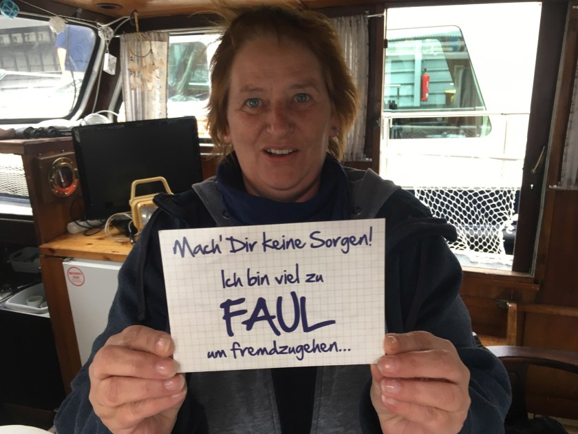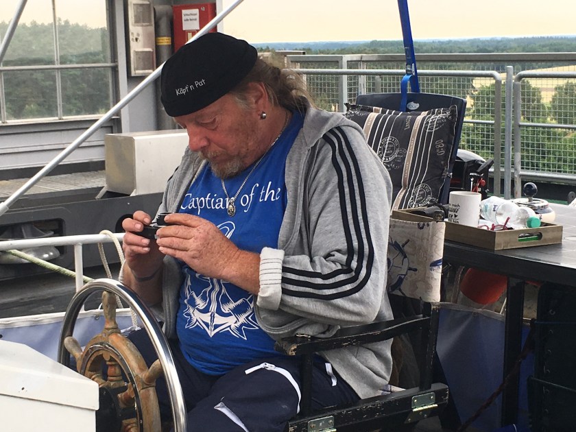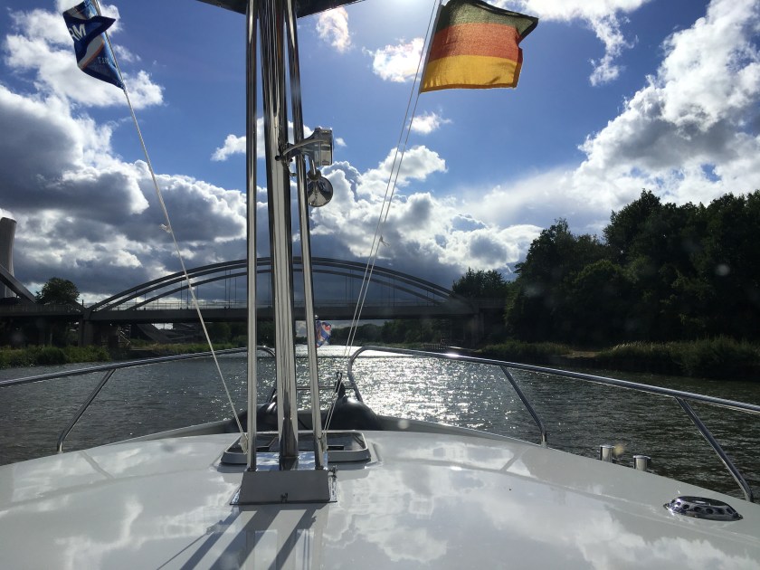 Nee, ik ben geen groot fan van het Hadelner Kanal, de verbinding van Bremerhaven aan de Weser, naar Otterndorf aan de Elbe. Het voormalig moerasgebied waar het kanaal door heen slingert, is een uitnodiging om gestoken te worden door dazen of horzels, waarbij niet ik, maar Nienke meestal de lekkerste is van de aanbiedingen aan boord. Zo geniepig en fluisterstil als ze aanvallen. Pas als ze je prikken heb je door dat ze er zijn. Niet alleen de insecten, maar eveneens de sluisjes van iets meer dan 5 meter doen me de billen samenknijpen bij het naar binnen varen. Gemene uitsteeksels en een lekkende opgehesen sluisdeur, die je schip vervuilt met aanhangende water, planten-troep en een baby-visje dat per ongeluk was mee gelift. Met onze 4.10 meter hebben we niet veel ruimte over als de ballen uithangen. Die rollen dan zo lekker omhoog, als je niet precies het midden houdt bij het in de sluis varen. Langzaam en vooral langzaam, pruts ik de Nine Marit naar binnen, Nienke als begenadigd afduwer op plekken waar het dreigt mis te gaan. Bij het uitvaren neig ik met het zwemplateau alsnog bijna een sluiswand te raken. Diep zuchten en het resultaat evalueren met Nienke helpt om mijn relaxte vaarrust te herstellen. We hebben de eerste twee sluizen waarvan er één een zelfbedienings-sluis is zonder schade genomen.