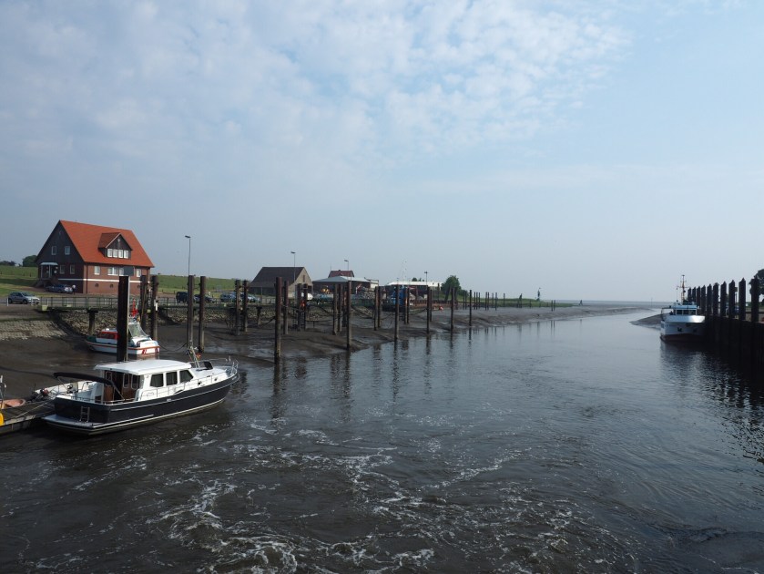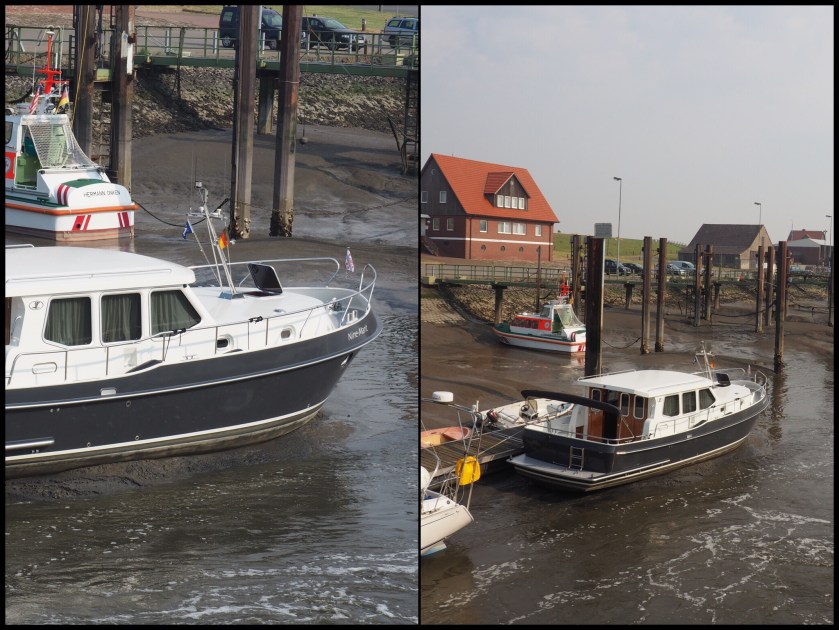 We hoopten een mooie plek langs het kanaal te vinden. Volgens de pilot, zouden er twee aanlegplekken zijn voor motorboten vlak na de sluis bij Meppen. Inderdaad, twee roestige steigers, waar onze motorboten langszij opgepropt en blootgesteld aan langsvarende beroepsvaart met veel inschikkelijkheid eventueel zouden kunnen liggen. Dat hebben we maar niet gedaan. Even na Meppen doken we een oude zijarm van de Eems in, waar we aan het eind in het doodlopende stuk een kleine jachthaven vonden en keurig opgevangen werden door een vrolijk babbelende havenmeester. €14 per nacht, stroom, water en douche inbegrepen, evenals een ondiepte waar je voor moet uitkijken als je de haven weer verlaat. De oude Eems-arm zag er wat spookachtig uit, boomstammen in het water en struiken die vanaf de oever ver over het modderachtige water reikten. Alsof in een mangrovebos vermoedde ik ieder moment krokodillen het water in te zien glijden vanaf verborgen plekken in het struweel aan de kant. Volgens Nienke houden krokodillen niet van de kou en komen ze in Nederland niet zo vaak voor. Maar je weet nooit, waren er laatst niet een paar roofdieren uit een dierentuin ontsnapt?