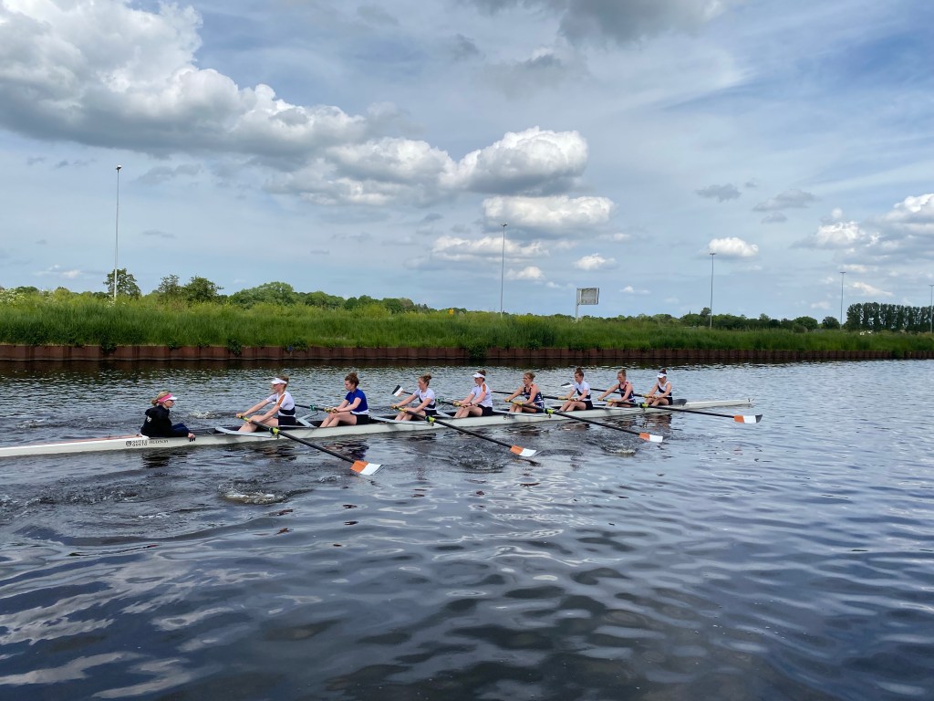 Het Noord Willems-kanaal dat we de volgende dag richting Assen bevoeren liet een afwisselend landschap zien, fris in het groen. Op het kanaal zelf zien we een komen en gaan van skiffs, tweetjes, viertjes (met of zonder stuurman/stuurvrouw) en een paar woest zwoegende achten van zowel vrouwen- als mannenploegen van roeivereniging Gyas. Nienke en ik hebben elkaar voor het eerst bij een Gyas-maaltijd ontmoet. Gyas lag destijds op een andere locatie in de buurt van het Eemskanaal. Een landelijke plek, waar een koe het presteerde het zadeldekje van één van onze fietsen, culinair te testen. Tegenwoordig ligt het clubhuis aan het Noord-Willemskanaal, een mooi breed, recht en vooral ook rustig kanaal, ideaal voor de roeisport. Langs het rechte stuk van het Noord Willemskanaal loopt een fietspad. Vanaf dat pad fietsen de coaches met de roeiers mee terwijl ze door een toeter opdrachten en commentaar schreeuwen. Een stuurvrouw in een viertje gaf op een merkwaardige manier het tempo aan; ‘Tweede klas, tweede klas, tweede klas’, in plaats van bv ‘In en uit, in en uit, in en uit’. Geen idee wat daarvan de diepere betekenis is, maar de roeiers voelden zich wel aangesproken om er nog harder aan de riemen te trekken. Zou het kunnen zijn dat ‘tweede klas’ slaat op de rangorde of de divisie die de ploeg in het wedstrijd circuit heeft ingenomen? Of bekt het gewoon lekker? Vanaf het fietspad klonk nog meer wonderlijks. Misschien heb ik het verkeerd verstaan: ‘niet snoeken, verdomme niet snoeken”. Commentaar dat meer lijkt te passen in de visvereniging, waar het ter plekke verboden is op snoek te vissen. Ik meen me vanuit mijn kortstondige roeicarière vaag te herinneren dat de term snoeken bij het roeien iets betekent als dat de roeispaan te diep in het water duikt waardoor er onbalans in het schip ontstaat. Bij skiffen leidt dat niet alleen tot onbalans maar ook nogal makkelijk tot onfortuinlijk omslaan, met gegarandeerd een nat pak. Vandaar mijn voorkeur voor de wat bredere bootjes die we tot op heden bevaren.