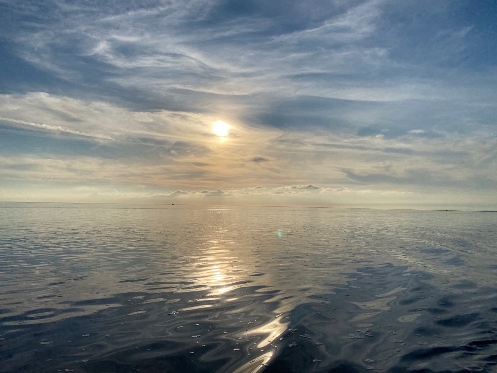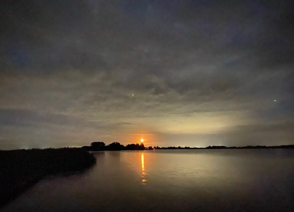 In verband met de te verwachten windstilte en veel meer wind de volgende dag, vertrokken we op dezelfde dag laat in de middag met opkomend tij weer naar Harlingen. De zonsondergang stuurboord achter ons leverde plaatjes voor een kalender. Het was rustig op het water, de veerboten schoven op afstand in de verte langs en net voor donker liepen we de Zuiderhaven van Harlingen binnen. Met wat stuurmanskunst en oplettend werk van Nienke vonden we een vrije plek helemaal achterin de jachthaven…
