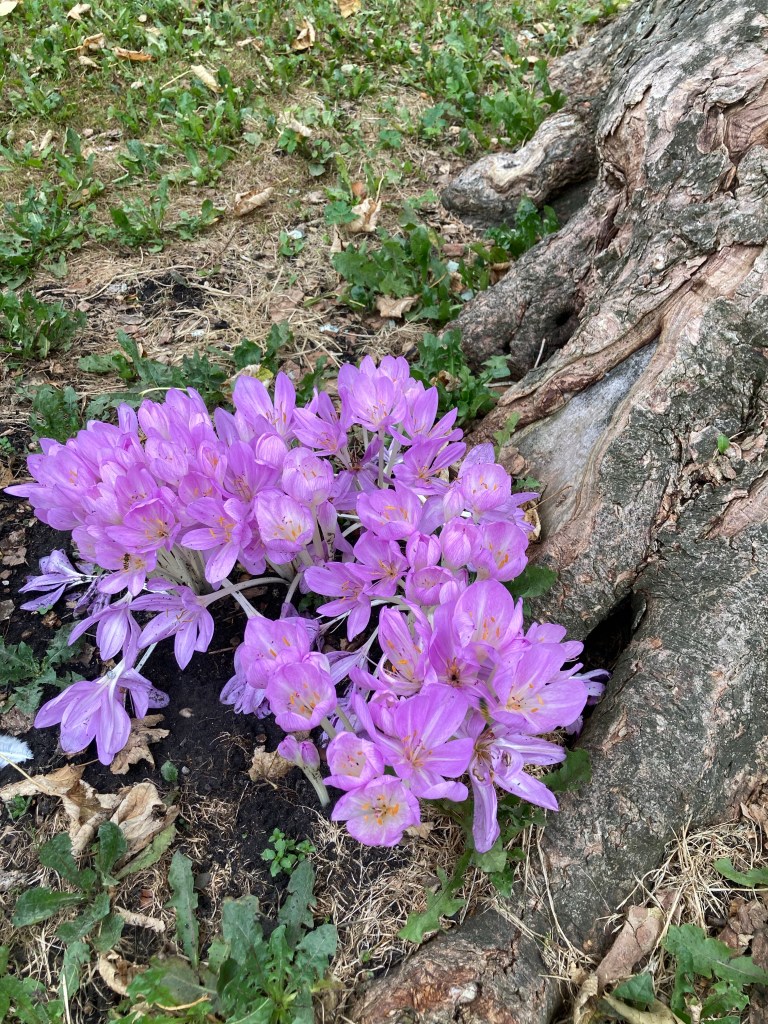 Dokkum en Leeuwarden kennen we al redelijk. Franeker was verrassend, in die zin dat we er ooit wel waren om het Planetarium te bezoeken of om naar een schitterend optreden van Toots Tielemans in de Korenbeurs te gaan. Het stadje verder bekijken kwam er niet van. Nu dus wel. De vele indrukwekkende oude panden in deze oude universiteitsstad zijn beslist de moeite waard om te bekijken. Het Martena museum, opgetrokken in grote gele en rode kloostermoppen imponeert in de hoofdstraat. Het museum was helaas gesloten maar de grote tuin erachter met prachtige grote bomen is altijd open. Bloeiende herfsttijloos( Colchicum autumnale) vond een mooie plek rond de wortels van een grote mij onbekende boom met een ruwe boomschors en kleine bladeren.