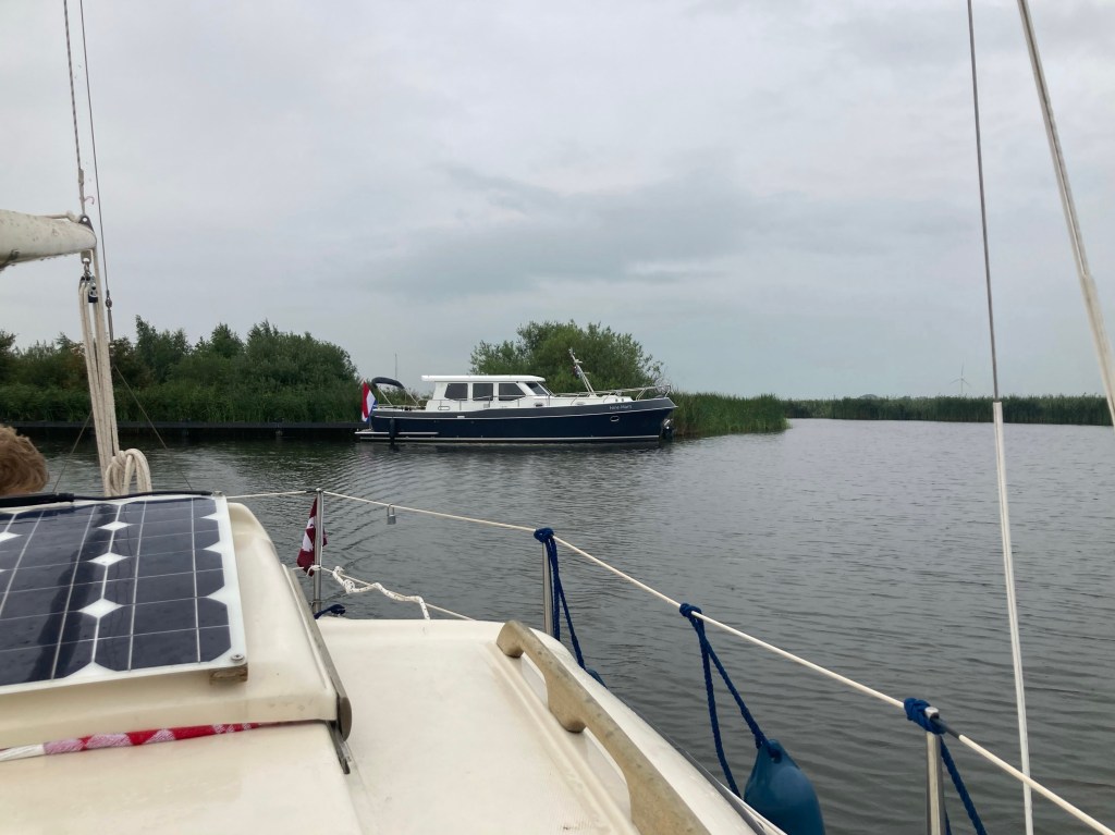 Het weer leek goed en aangenaam te worden. Hardzeildag is in de Sneekweek altijd op woensdag. Uitstekend idee om met ons schip de drukte te ontvluchten. Aanstalten maken om te gaan kost ons altijd moeite. Het huis goed achterlaten, welke kleren moeten mee, en wat zullen we onderweg eten. Boodschappen doen en dan even later merken dat we weer wat vergeten hebben, zodat we nadat we dachten klaar te zijn toch nog opnieuw naar de supermarkt moeten. En als we dan ook nog bij het aan boord gaan merken dat het achterschip wederom is onder gekakt door het zwemmende gevogelte is een deel van de pret pas weer op acceptabel niveau als we de box uitvaren en koers zetten naar de meren.