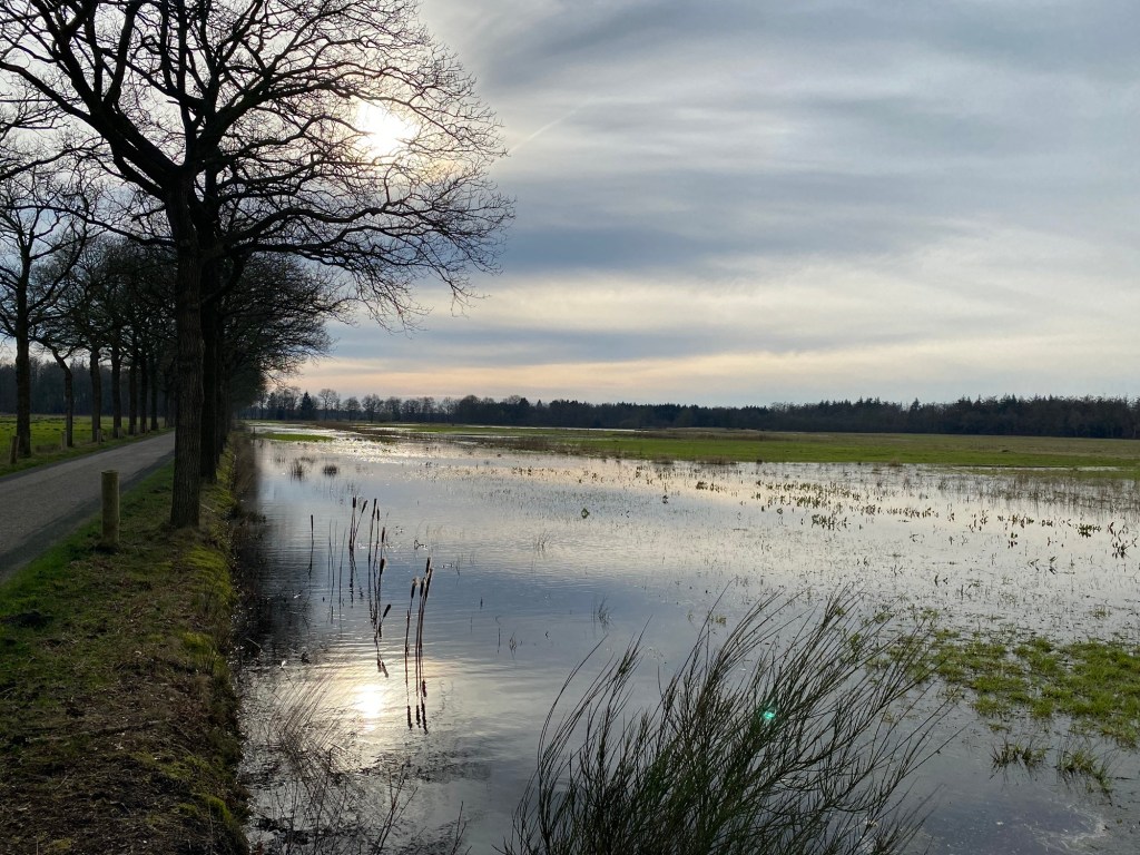 Dit gebied is natter dan normaal door de vele regen in de laatste maanden. De camping was ooit een boerenbedrijf, de vader van de huidige boer heeft zijn terrein verkocht om het weer terug te geven aan de natuur. Nu kijken we uit over een natuurgebied waar tussen de planten kleine vennetjes lijken te zijn ontstaan. Op de fietstocht die we in de middag maakten zagen we op veel plekken de bomen in het water staan alsof het mangrove-bossen waren. Een fietspad was afgesloten door de wateroverlast.