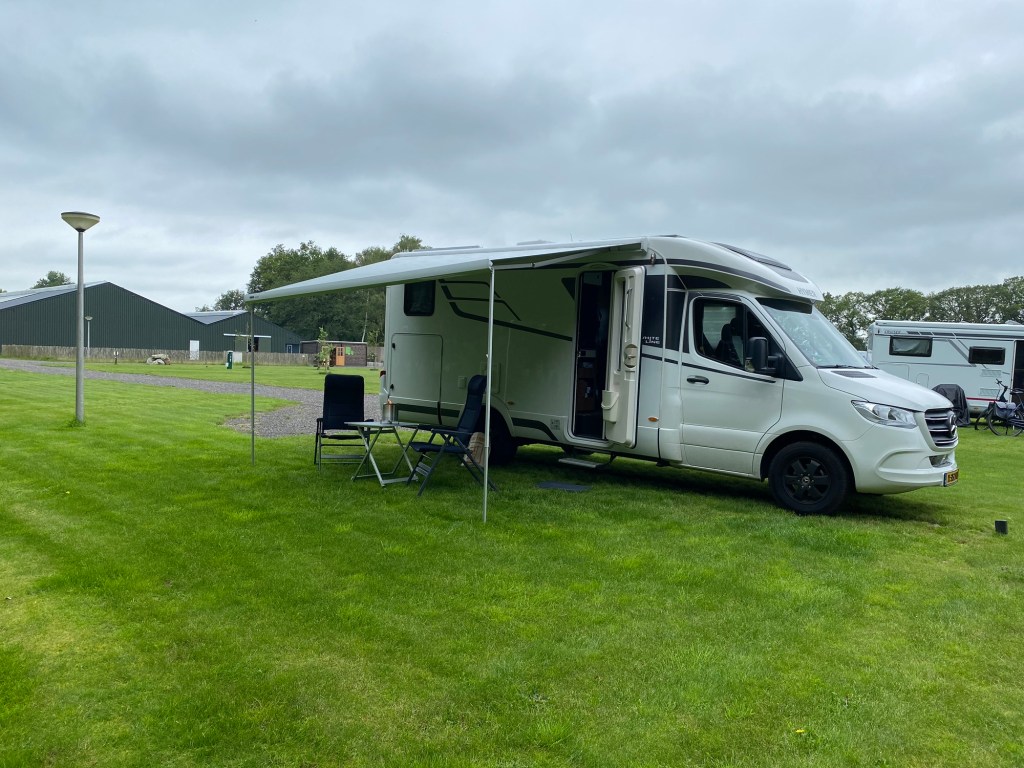 Op Camperplaats ‘Op de Bult’ staat al een grote blauwe tot woonmobiel omgebouwde bus als we het plekje ernaast willen inrichten. Met twee getrapte blokken onder de voorwielen staan we vrijwel waterpas. De ontvangst was hartelijk. De eigenaar van de Camperplaats liet ons zien waar we allemaal konden gaan staan en vertelde waar alles was en wat er kon.