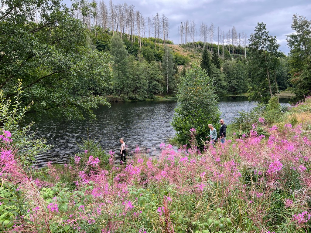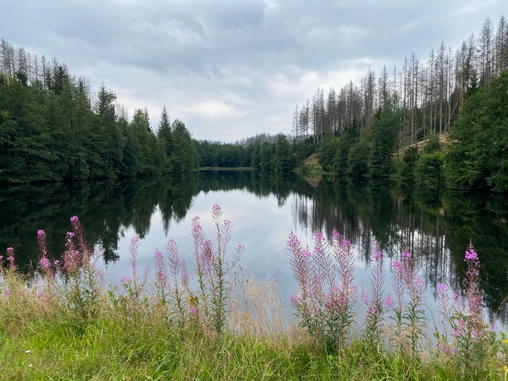 De hoogste berg is de Brocken, 1142 meter hoog, net niet te zien vanuit onze camperplaats. Fraai is het stuwmeertje vlakbij de camperplaats. We maakten met ons vieren een wandeling er omheen. Het vinden van een grote diversiteit aan planten waarvan in Nederland een aantal op de rode lijst staan, was een aangenaam cadeautje. Later, vlak nadat we vertrokken waren, reden we langs een heel groot stuwmeer waar werd gezeild en waar een rondvaartboot zijn spoor trok over het helderblauwe wateroppervlak. Het plan om de ‘moet je zien waterval’ naast het stuwmeer te bezoeken hebben we laten vallen; te veel toeristen. De nieuwe plek om te overnachten, aanbevolen door de camper-app, bleek voor ons niet aanbevelenswaardig. We hadden ons verheugd op een goed restaurant om gezamenlijk onze ontmoeting af te sluiten. De standplaats op een overmaatse betonnen stoeptegel met hek als uitzicht kon ons niet bekoren. De lucht in het ‘gourmet-restaurant’ bleek vooral te bestaan uit een mengsel van verschaalde biergeuren en de vluchtige gevolgen van jarenlange lucht-verpestende rokers. Dus op zoek naar een andere plek. Gelukkig is Fenny een technisch zoekwonder op het internet. Ze vond een camper-plek met restaurant. Wel zo’n 100 km rijden, maar ach, rijden in de camper is leuk. Het restaurant bij de nieuwe camper-plek, een zeer goed restaurant volgens Google, bleek gesloten, nou ja, wel open maar ‘besloten-open’ voor een familie partijtje. Uiteindelijk zijn we verwend in een aanbevolen schnitzel-specialiteiten restaurant in het stadje. Een half uur lopen, maar goed, dan krijg je ook wat. Het was lekker, de schnitzel van de bil van regionale biologische varkens, evenals het biologische zelfgebrouwen bier……, en over het knullig geserveerde ijsje in een kartonnen bekertje met een toefje slagroom zullen we het dan maar niet hebben…..