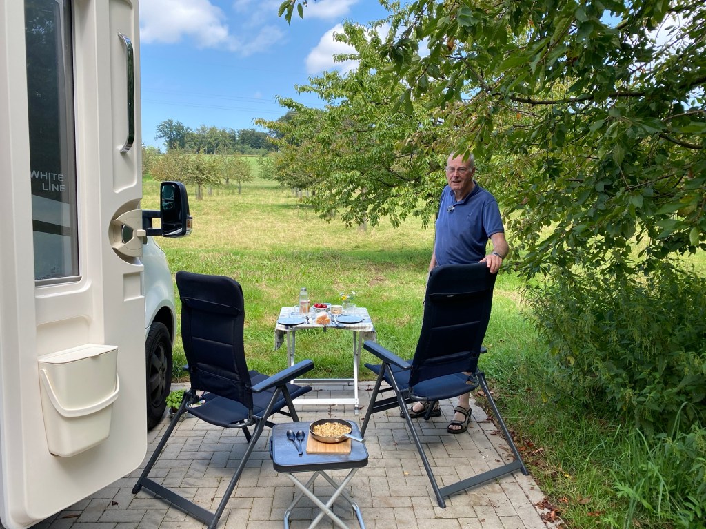 Langzamerhand krimpen we de camper in en wennen we aan de afmetingen. Mijn kop stoot ik nog wel af en toe maar het wordt minder. De locaties waar we komen te staan zijn steeds weer een verrassing. Aan de rand van een kersenboomgaard, bij het dorpje Hagen, worden we geïnformeerd dat er bijna 300 verschillende kersen-variëteiten staan, een databank van allerlei vergeten soorten. De namen van al die kersen-bomen kan ik niet meer ophoesten, maar volgens de bordjes variëren de kleuren van de kersen van pikzwart tot licht geel. Helaas zat er geen kers meer aan de bomen. De kersentijd is overgegaan in de pruimentijd. Het wordt dus een krap jaartje wachten om de vermelde uitnodiging te aanvaarden om vrijelijk van de kersen te mogen snoepen. De camperplaats is eenvoudig, maar alles wat je nodig hebt is er, water, plek om grijs water te lozen, elektriciteit en toilet. Met de neus van de camper naar de boomgaard en onze benen uitgestrekt onder een kersenboom is het goed toeven. Door de boomgaard loopt een pad naar het bos. We maakten een wandeling van 3 uur door het afwisselende landschap. Af en toe steil omhoog over een met stenen bezaaid pad waar overvloedige regen diepe geulen had uitgeslepen. Onderweg snoepten we van de bramen langs het pad.